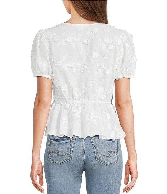 Blu Pepper Floral Embordered Short Puff Sleeve Tie Front Top