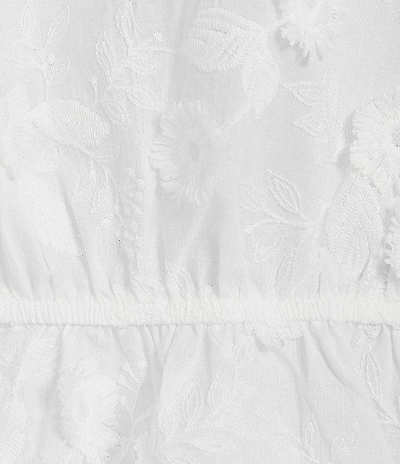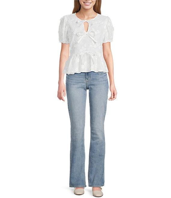 From Blu Pepper, this top features: Floral embroidered fabric Round neckline Short puff sleeves Tie-front closure Pullover styling Cotton/polyester Hand wash /flat dry Imported.
