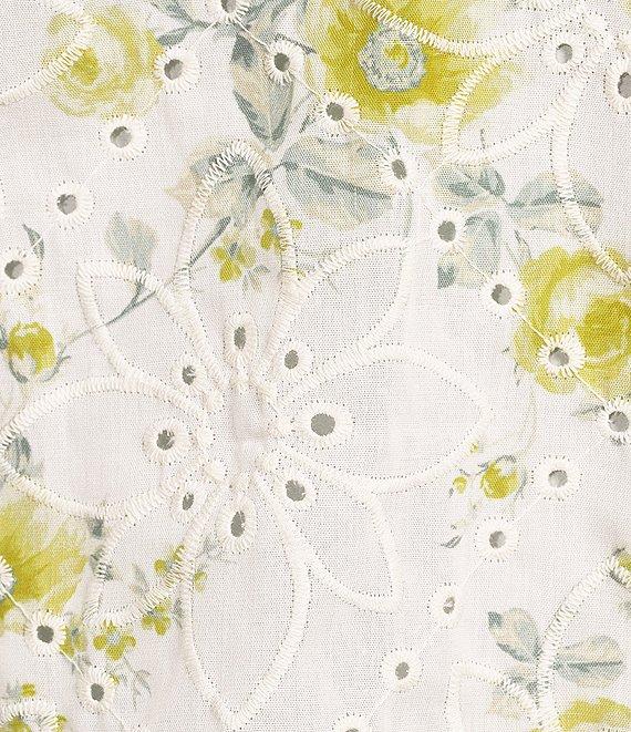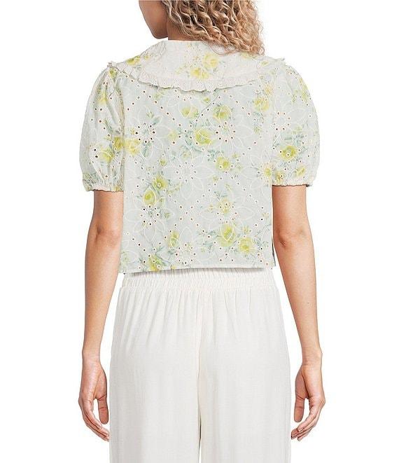 From Blu Pepper, this top feature: Floral print embroidered fabric Collared V-neckline Short sleeves Cropped length Polyester/cotton Hand wash /flat dry Imported.