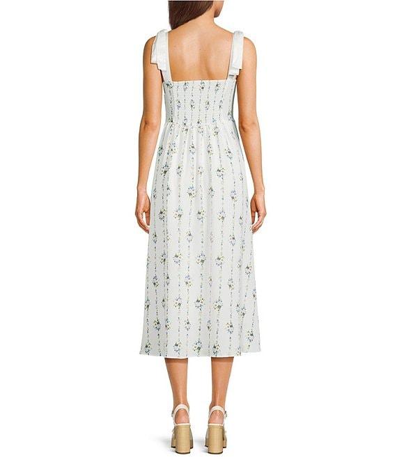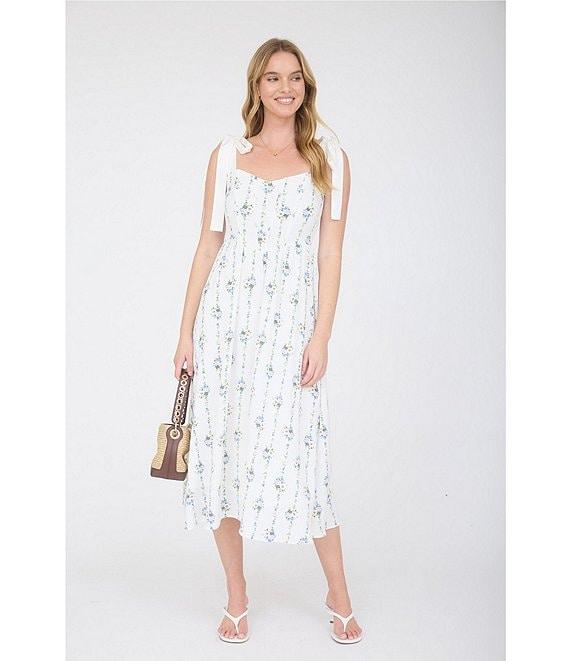 Blu Pepper Floral Printed Sweetheart Neck Ribbon Tie Shoulder Midi Dress