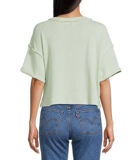 From Blu Pepper, this top features: Knit fabric V-neck Short sleeves Front pocket Straight hem Pullover styling Polyester/cotton/spandex Hand wash/flat dry Imported.