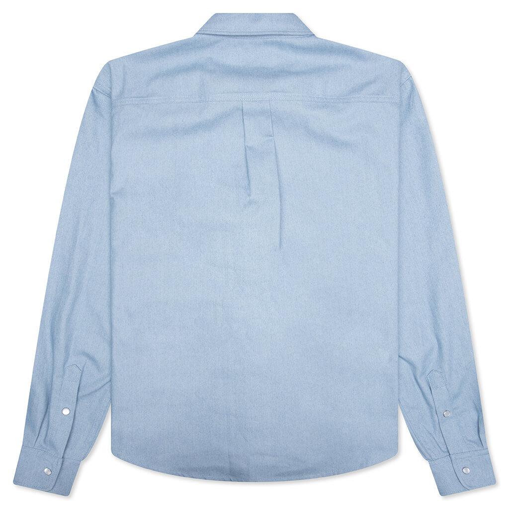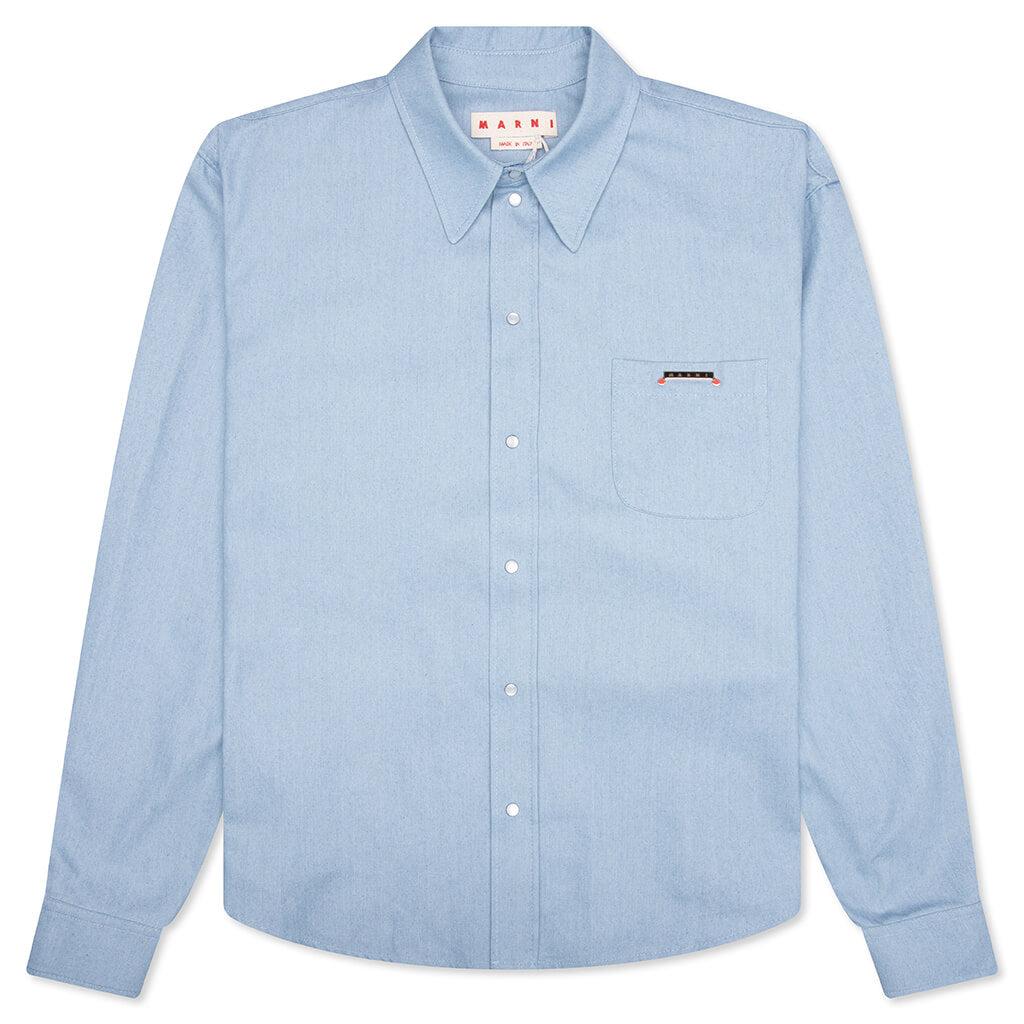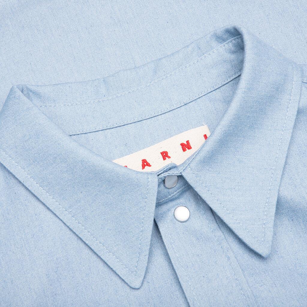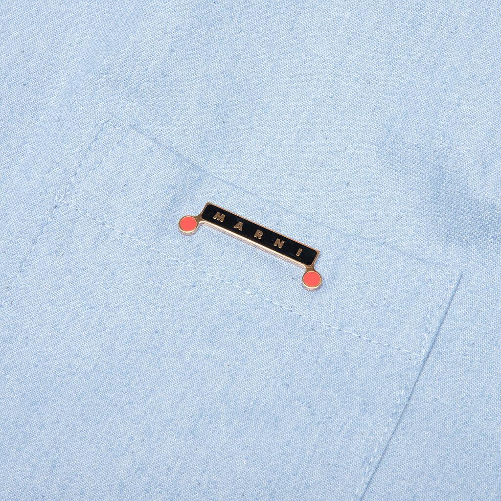 The Marni Blue Denim Shirt with Trunakaroo Plaque in iris blue brings a bold, modern twist to a classic design. Made from cotton, it offers a soft, breathable feel. The button-front closure and polo collar add refined details, while the boxy fit ensures comfort with a contemporary silhouette. Finished with an original print, this shirt is a standout piece that adds personality to your wardrobe. 100% Cotton Button front closure Polo collar Boxy fit Original print Style No: CUJU0015A2 UTC476 00B50
