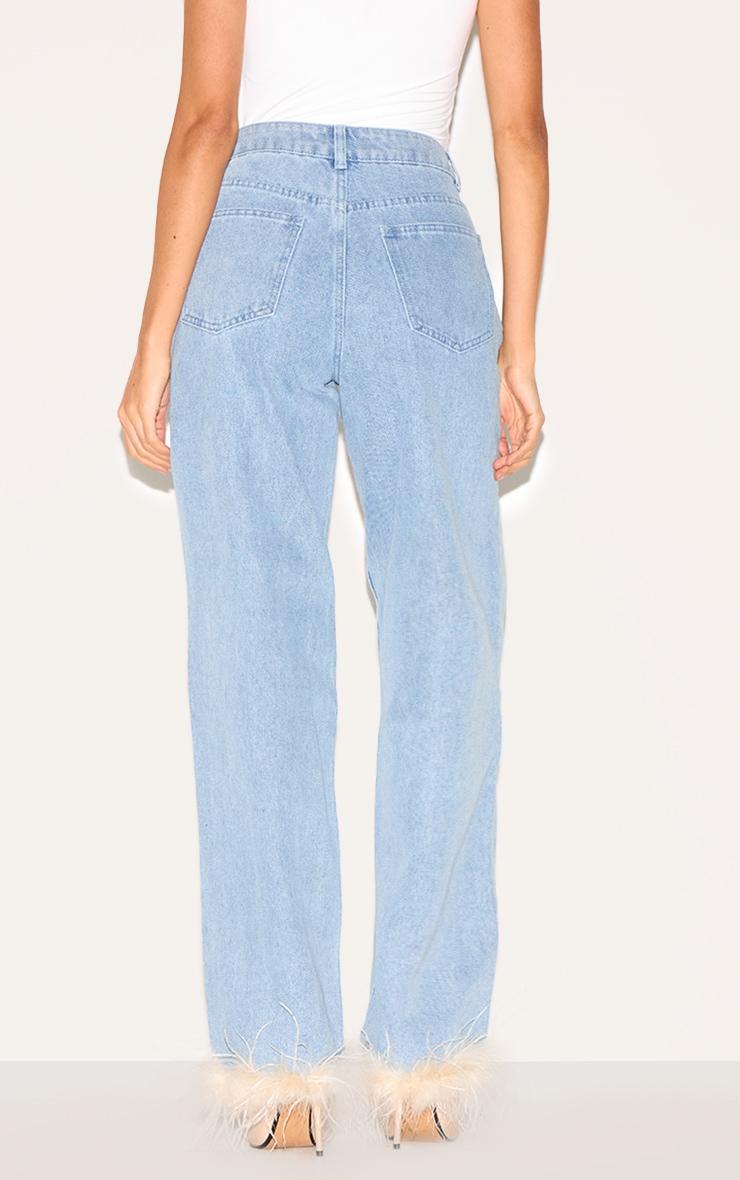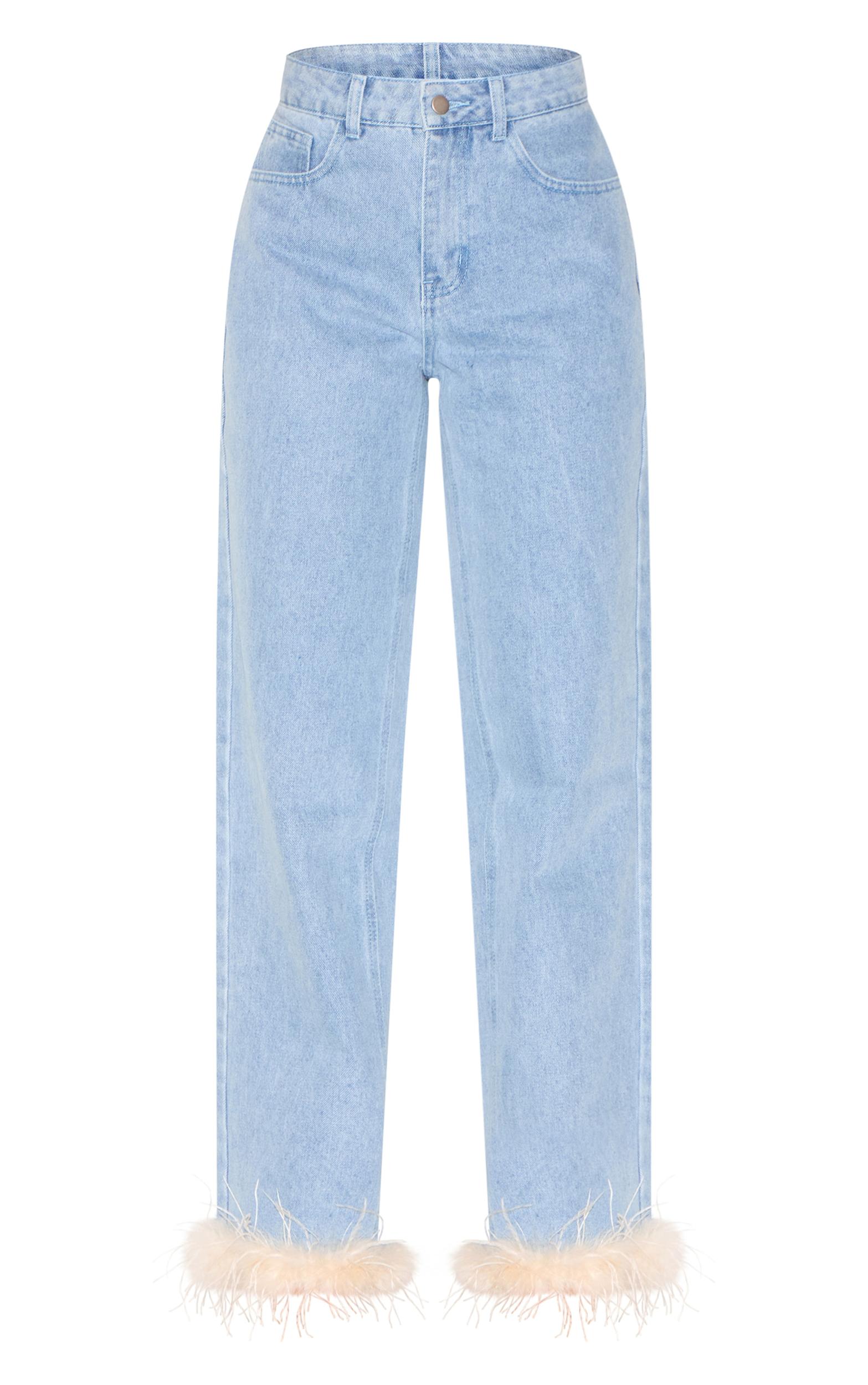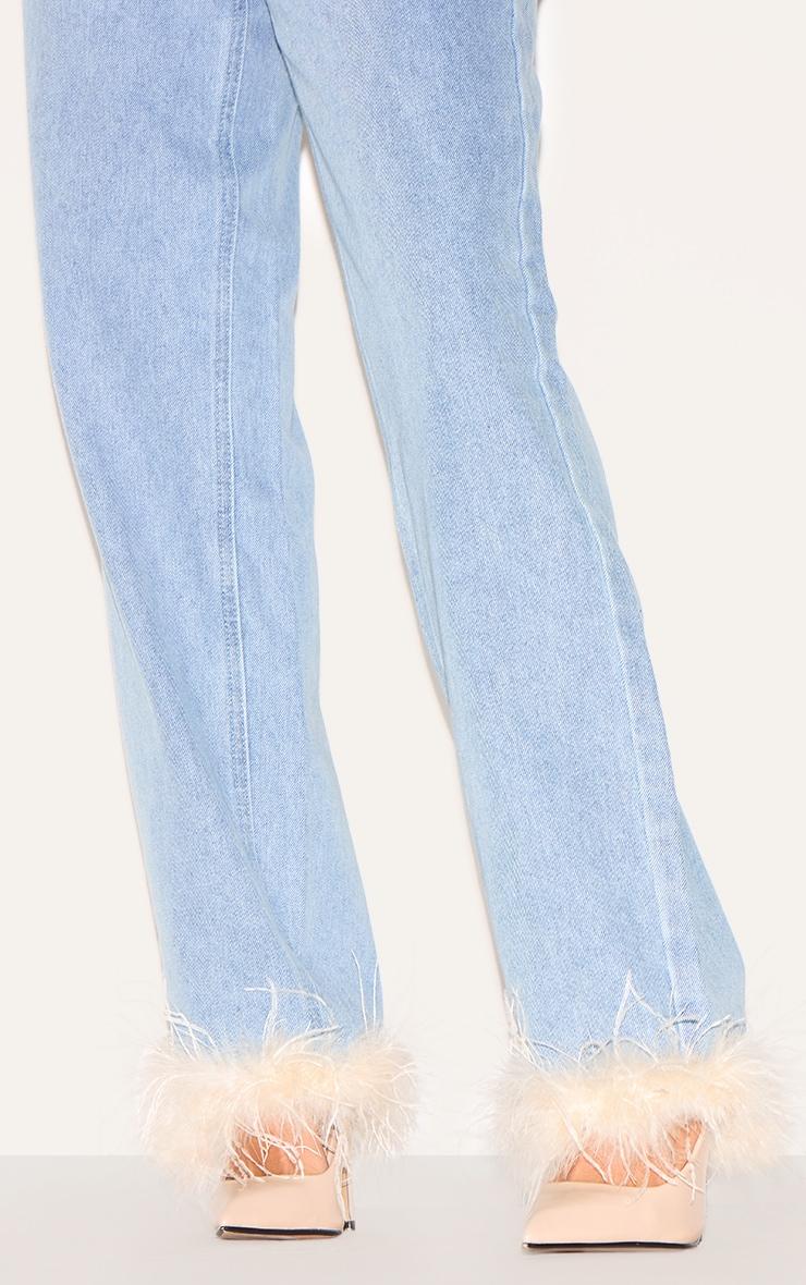 Meet your new after-dark denim. These straight-leg jeans in a vintage-wash blue offer a contemporary silhouette, elevated by a tactile feather trim. The denim provides structure and a nod to timeless style, while the unexpected detail introduces a touch of playful sophistication. Consider this your new go-to for making a statement. Style yours with a sharply tailored blazer and barely-there heels, or offset the jeans with a sleek bodysuit. Don't forget to add a chain-detail mini bag from our accessories collection to complete the look. Length approx 78cm/30.5inch (Based on a sample size UK 8) Model wears size UK 8/ EU 36/ AUS 8/ US 4Model Height - 5ft 8inchp]:!mb-4inch>Category: DenimProduct type: Straight Leg JeansColor: BlueMaterial: Rigid DenimSleeves: LongOccasion: Evening