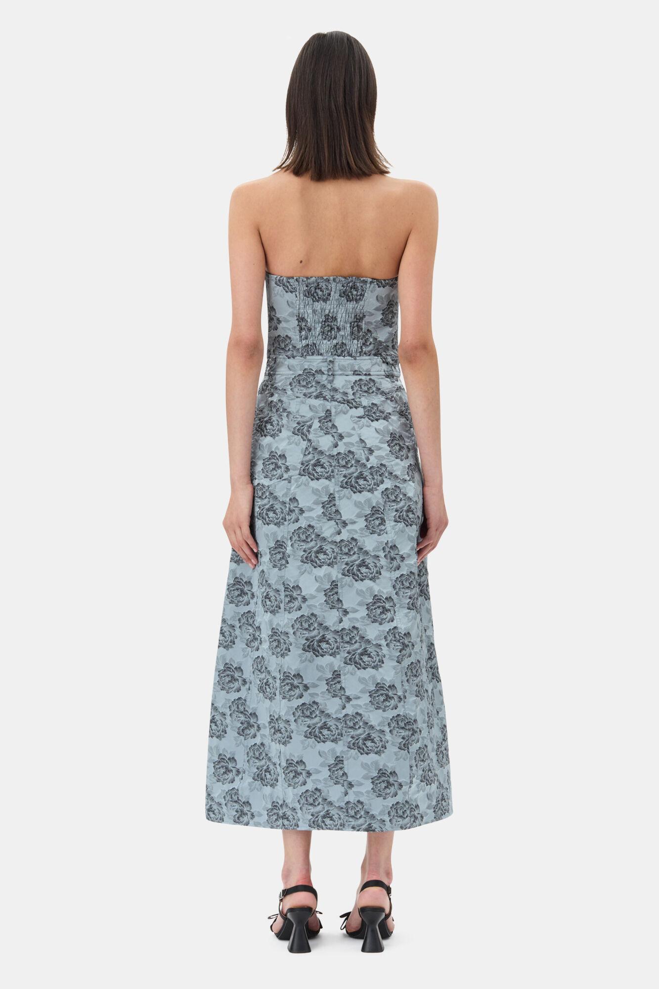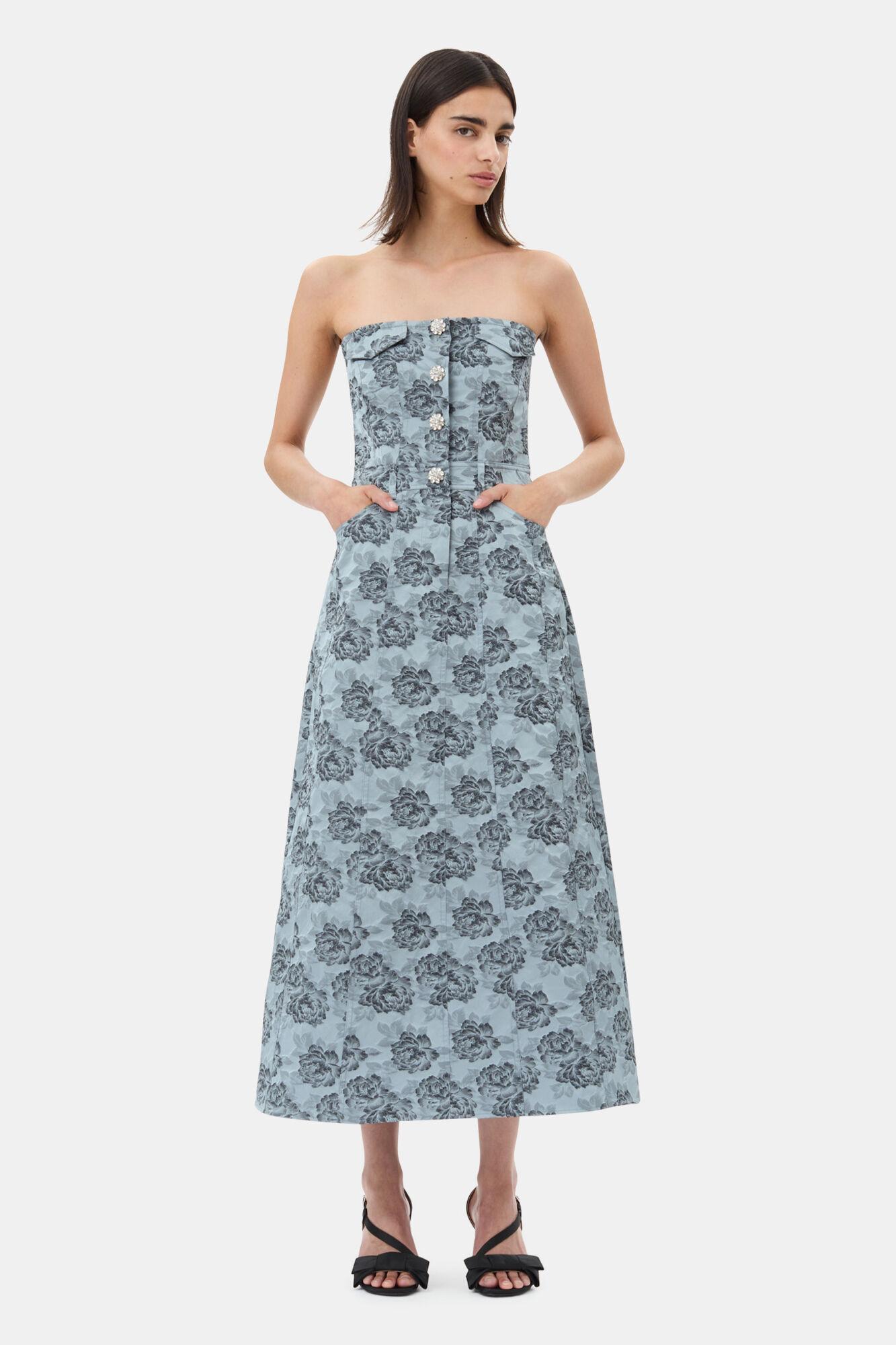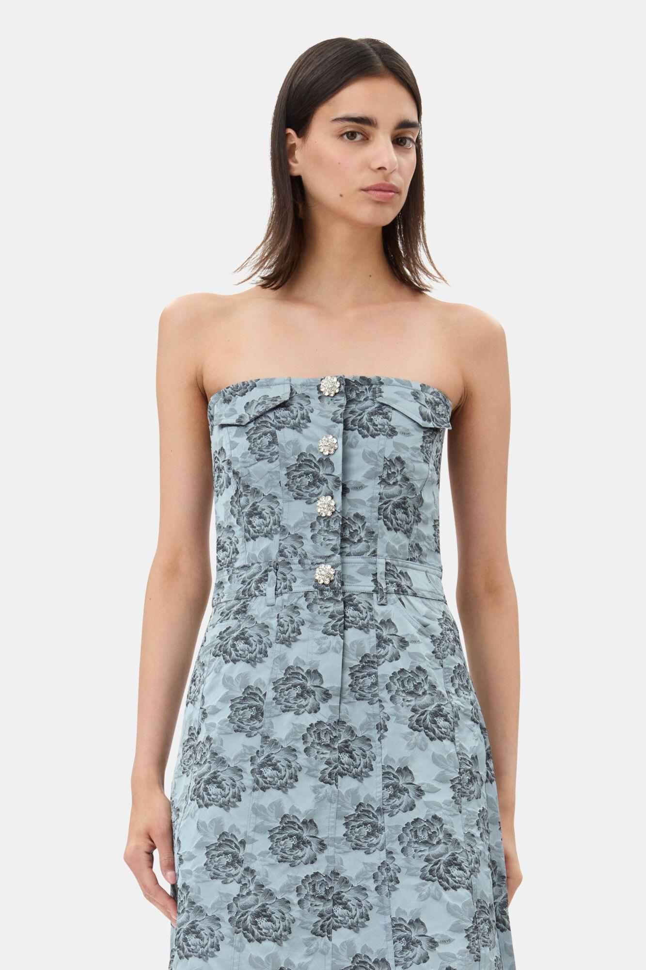 This Blue Floral Jacquard Long Corsage Dress features a strapless, A-line silhouette with an all-over floral print in shades of blue and black. The bodice is fitted with button details down the center, belt loops at the waist, and decorative pockets at the front and sides.