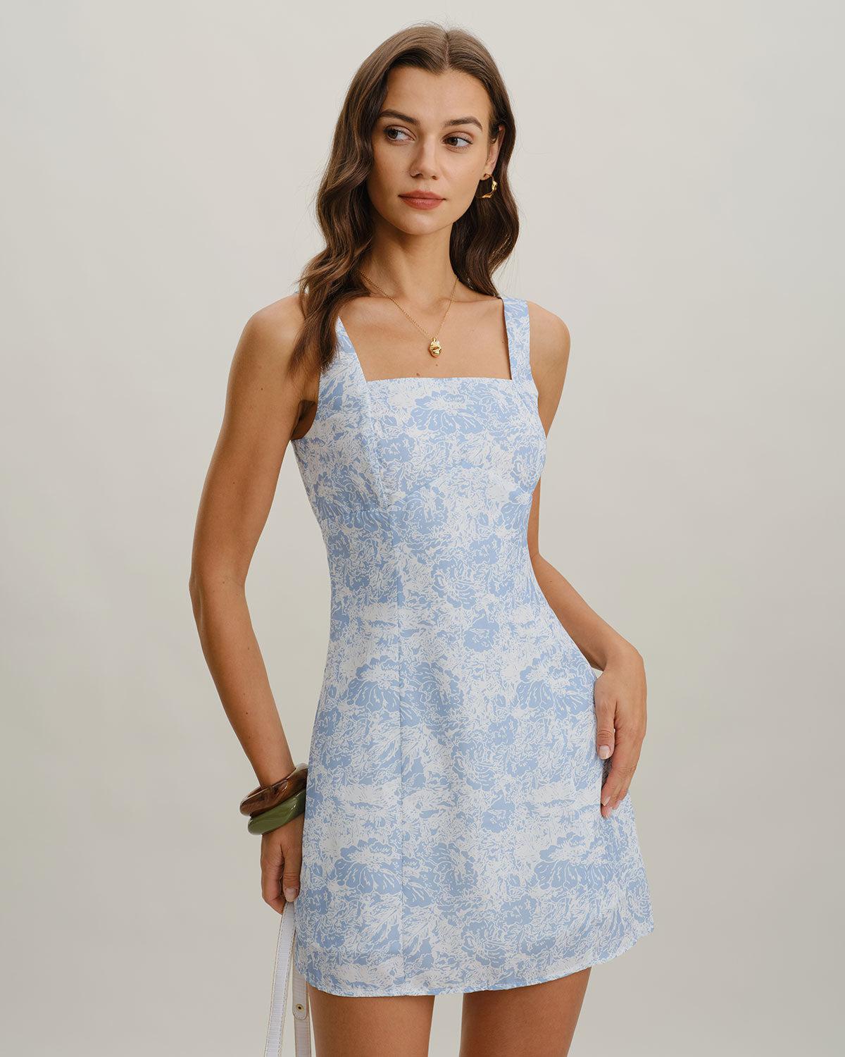 Blue Floral Square Neck A-Line Slip Mini Dress