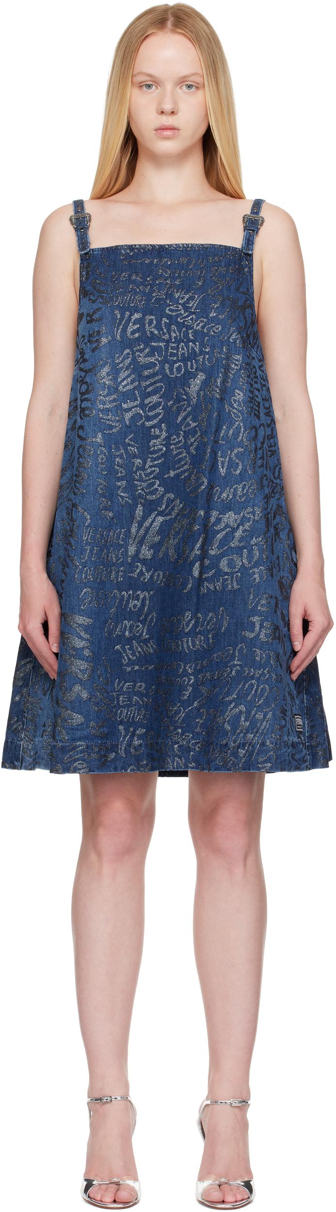 Non-stretch denim minidress. · Glittered text printed throughout · Square neck · Pin-buckle shoulder straps · Seam pockets at waist · Logo-engraved antiqued silver-toned hardware Supplier color: Indigo