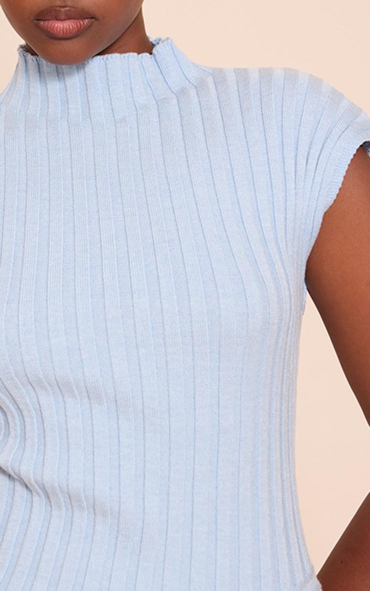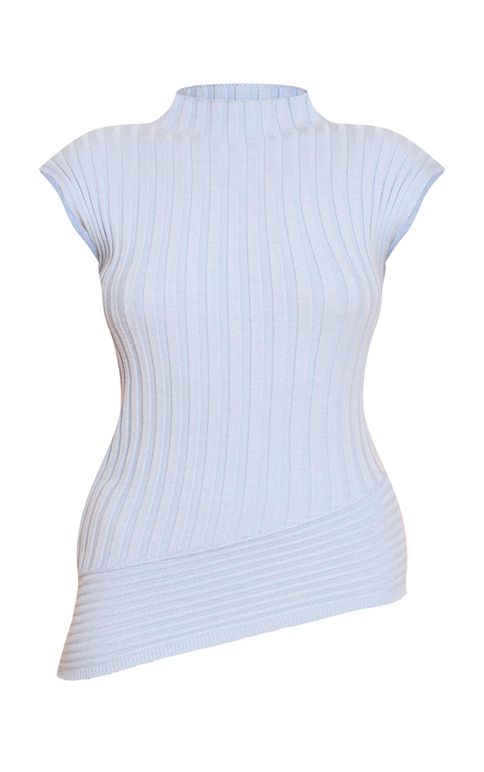 Opt for a fashion-forward finish in this blue high neck asymmetric detail top. Made from baby blue material with capped sleeves, a high neck and an asymmetric hem, it's a timeless silhouette with a twist. Simply add a complementing blue skirt, perspex kitten heels and understated jewelry for a cohesive look.Length approx 48.5cm/19inch (Based on sample size S)Model wears size SModel Height - 5ft 9inchp]:!mb-4inch>Category: KnitwearProduct type: TopColor: BlueMaterial: Rib KnitOccasion: Day