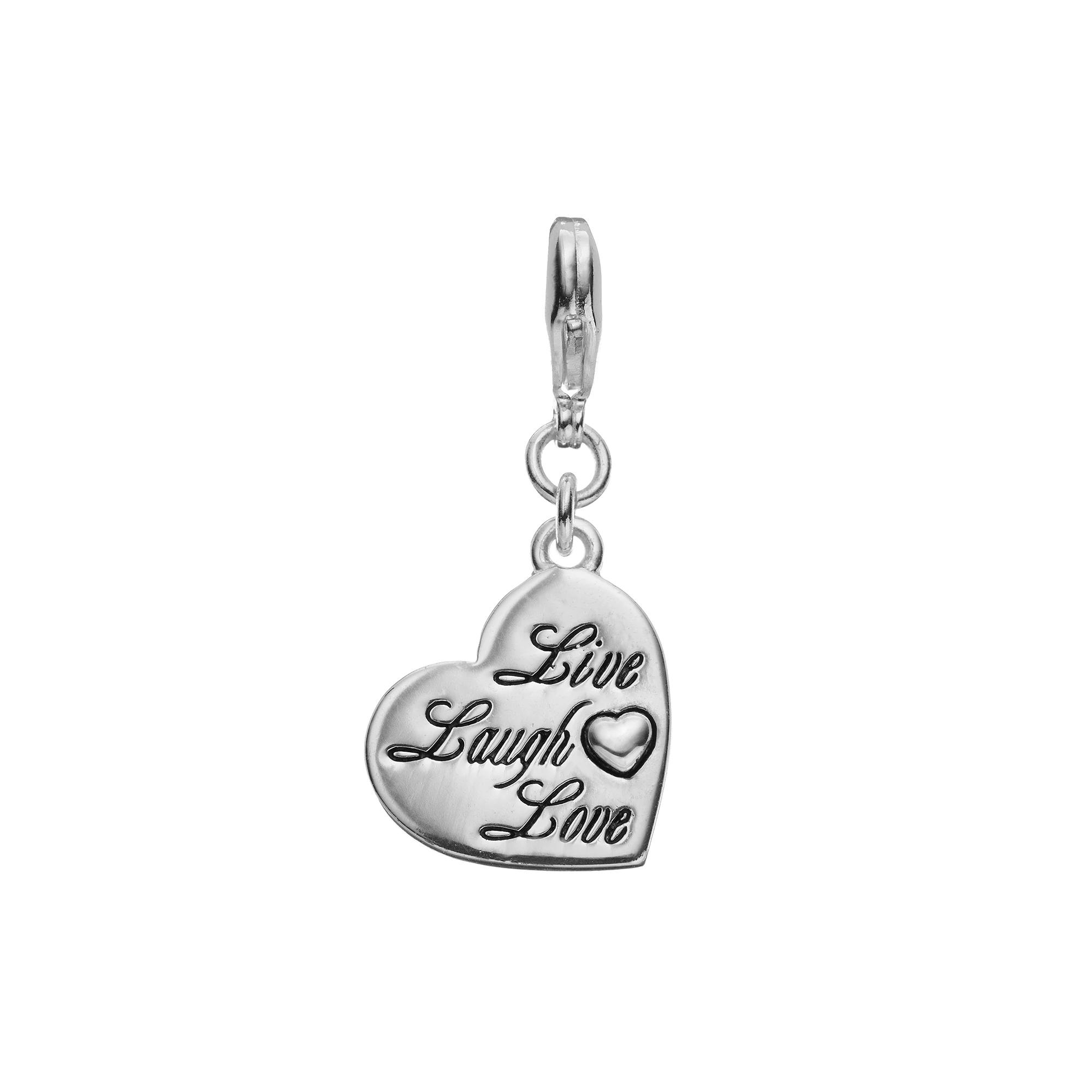 Adorned with a Live Laugh Love inscription, this heart-shaped charm adds a carefree touch to your Blue La Rue jewelry.Watch the product video here.CHARM DETAILS Length: 1.25 in. Clasp: lobster-claw Metal: silver-plated brass Inscription: Live Laugh Love Size: One Size. Gender: female. Age Group: adult. Material: Silver Plate Brass.