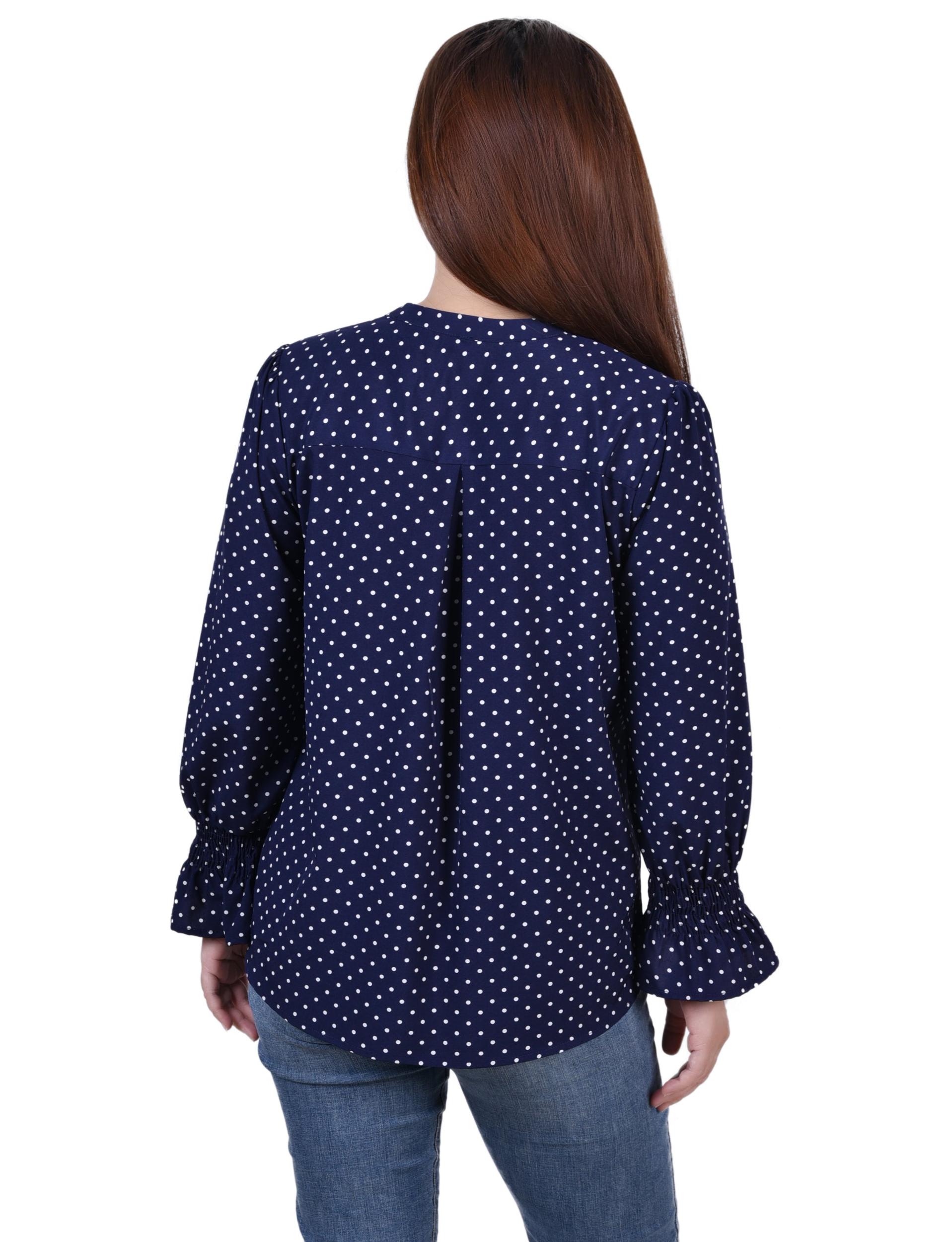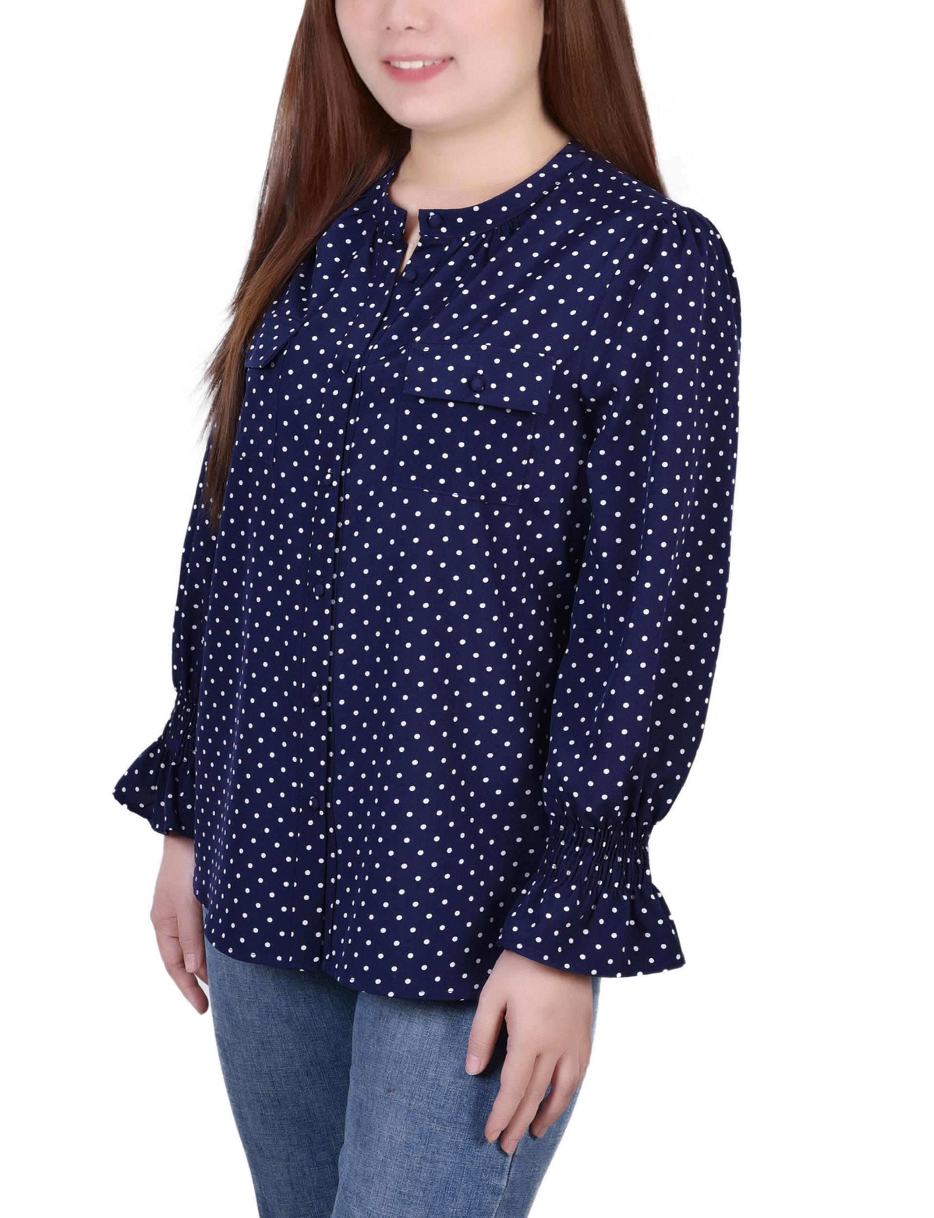 Blue Long Sleeve Button Front Blouse - Petite