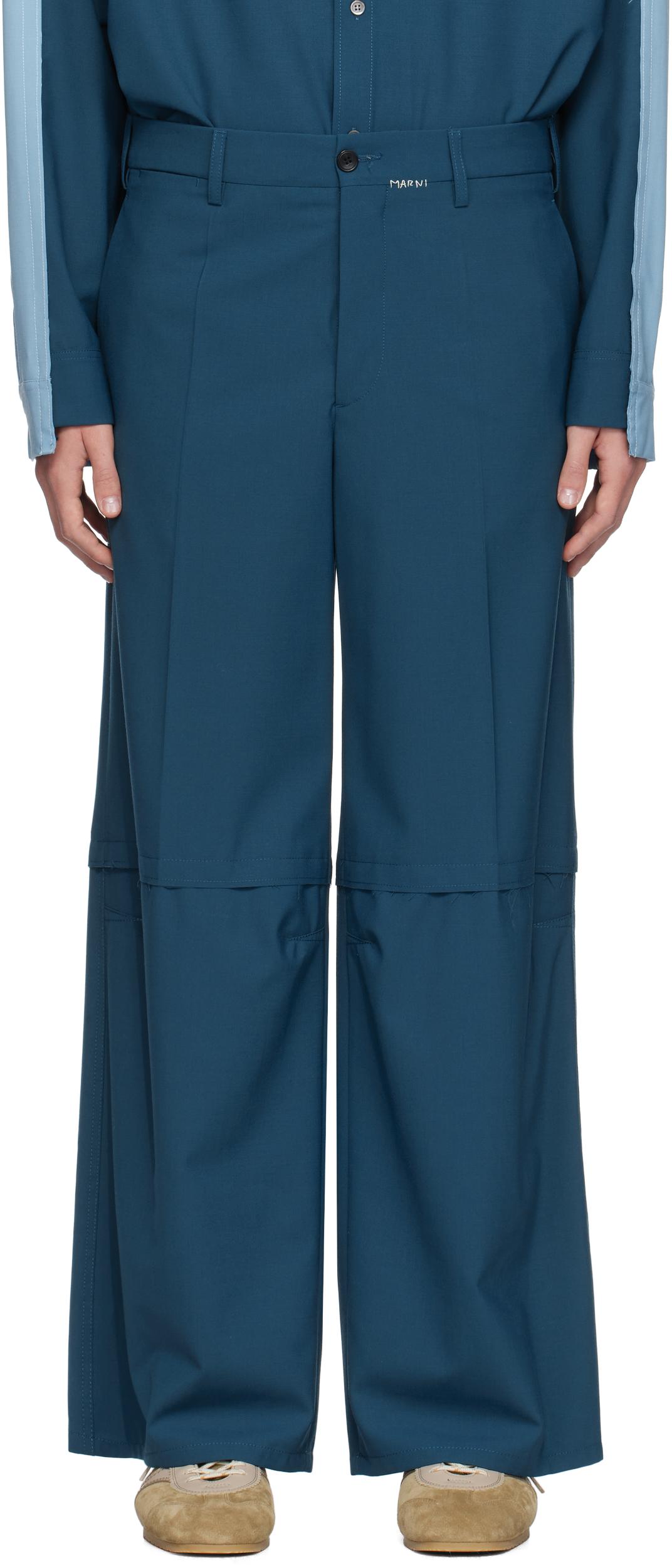 Plain-woven stretch polyester- and virgin wool-blend trousers. · Paneled construction · Belt loops · Hand-stitched logo at waistband · Four-pocket styling · Button-fly · Creased legs Supplier color: Orion blue