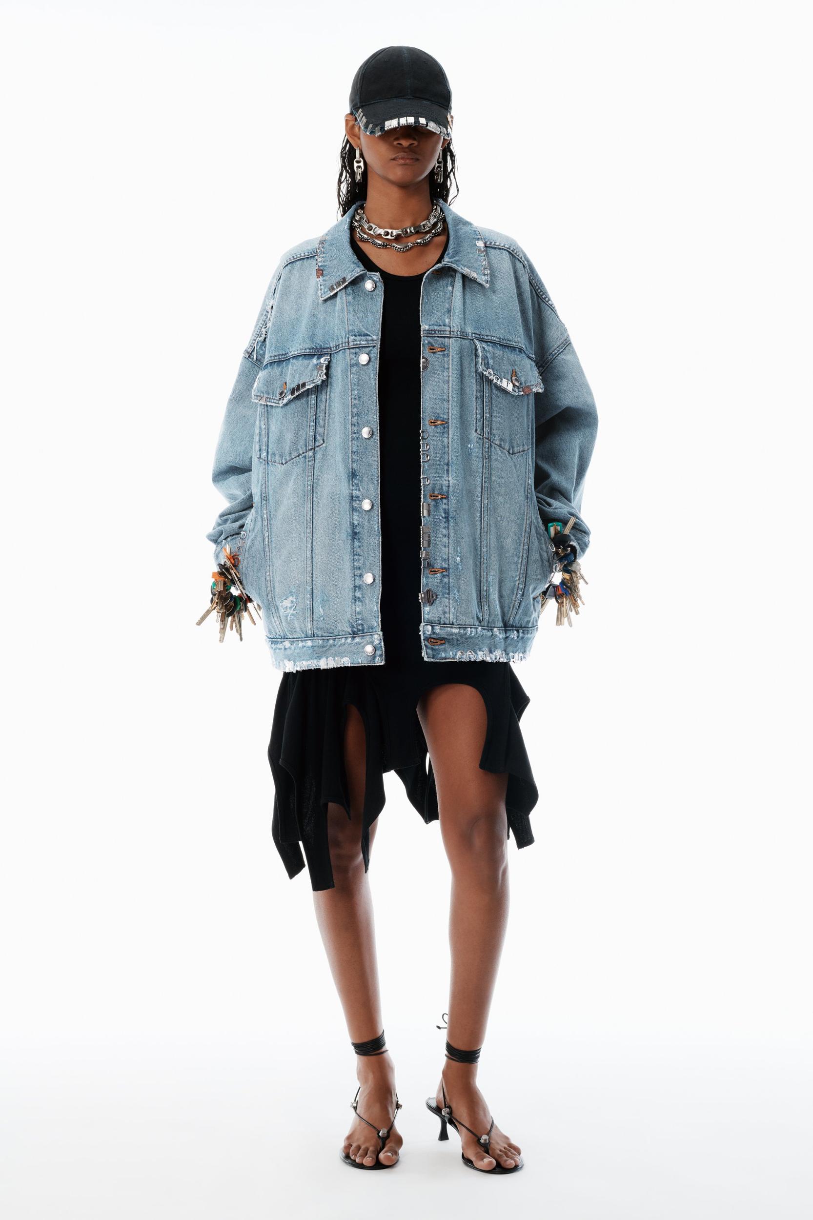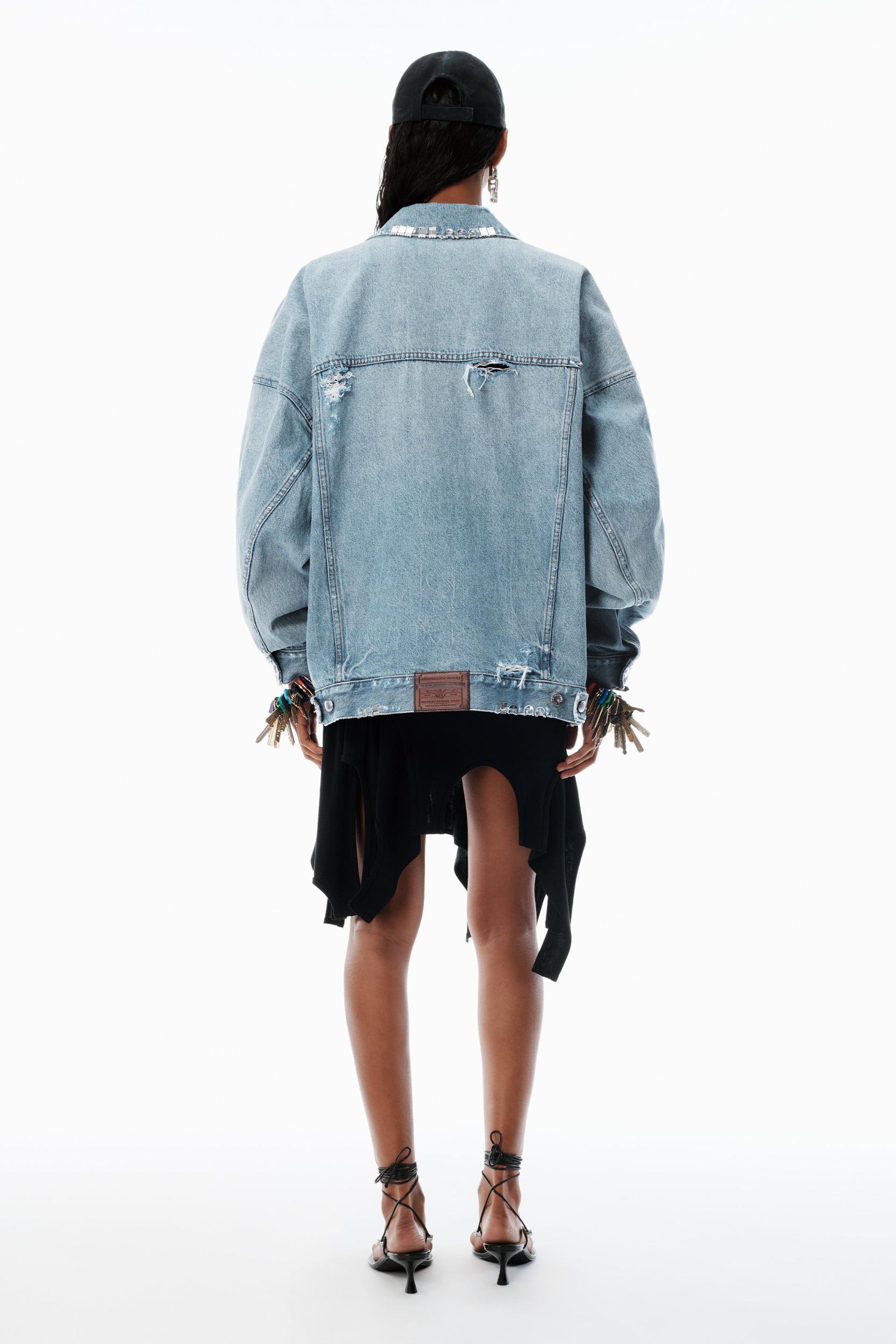 This powder blue trucker jacket features hand-appliquéd hardware punctuating the oversized style. Wide dropped shoulder seams accentuate the look of this outerwear statement piece.