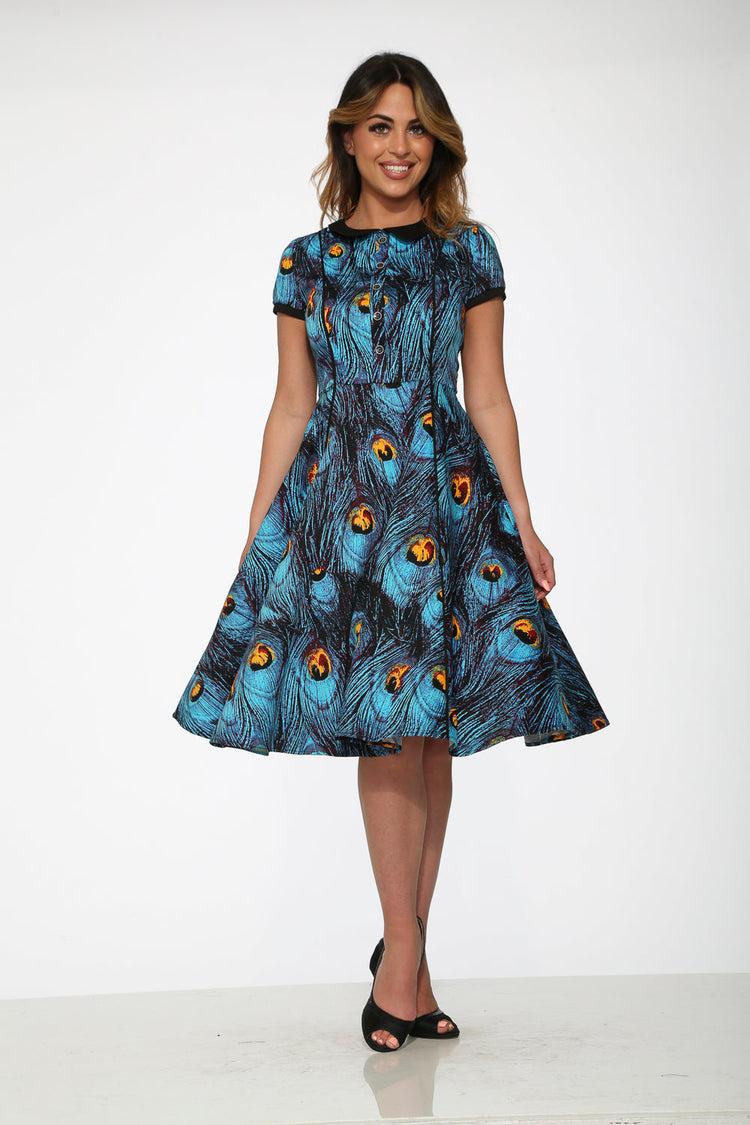 Graceful and bold, the Blue Peacock Swing Dress by Orchid Bloom is a statement piece that’s sure to turn heads. Featuring an eye-catching peacock-inspired print in rich shades of blue, this classic swing silhouette brings a touch of elegance to everyday wear.Crafted from a soft cotton-spandex blend, it offers just the right amount of stretch for a flattering and comfortable fit. With a center back zipper and convenient side pockets, this dress is as functional as it is fabulous.Fabric Composition97% Cotton, 3% SpandexFabric provides stretchLength: 41"ImportedDesign DetailsCenter back zipperSide pockets