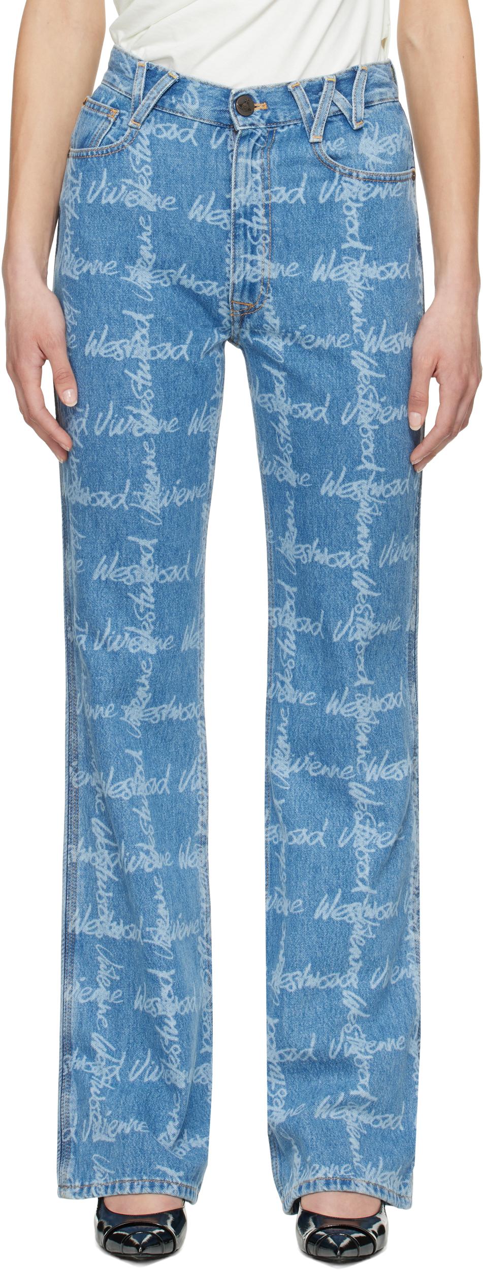 Flared non-stretch organic cotton denim jeans. Logo pattern printed throughout.