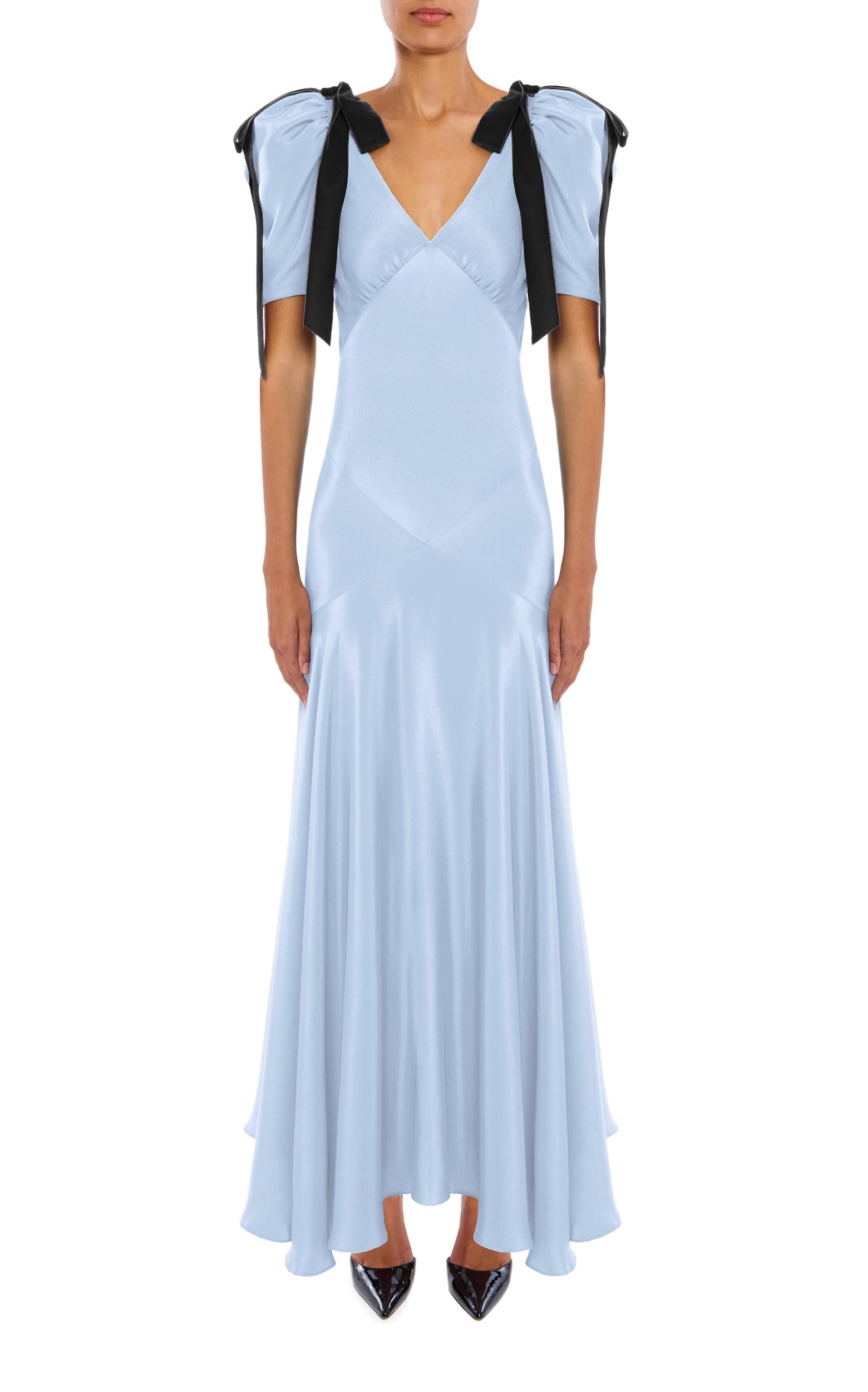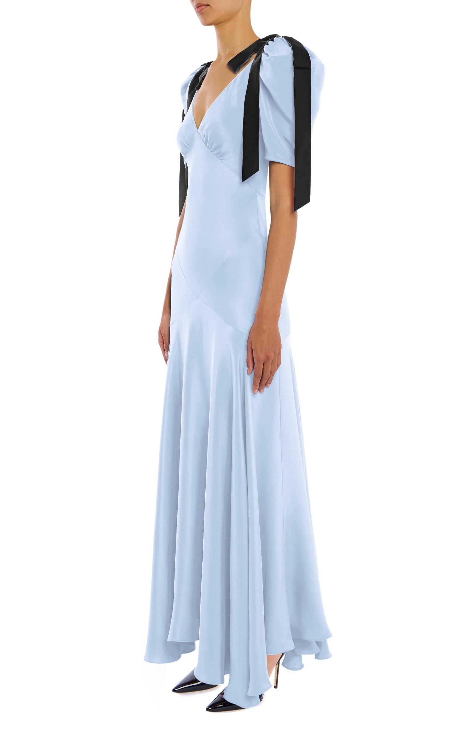 Cut on the bias in lustrous pastel blue silk two ply crepe, this bias cut gown features an inlay of cross body panels, echoed by black velvet bows that tie over the puff shoulders. The empire waistline gently flares to a maxi length, and is fit to perfection. This dress is lined with a complimentary off- white silk crepe.