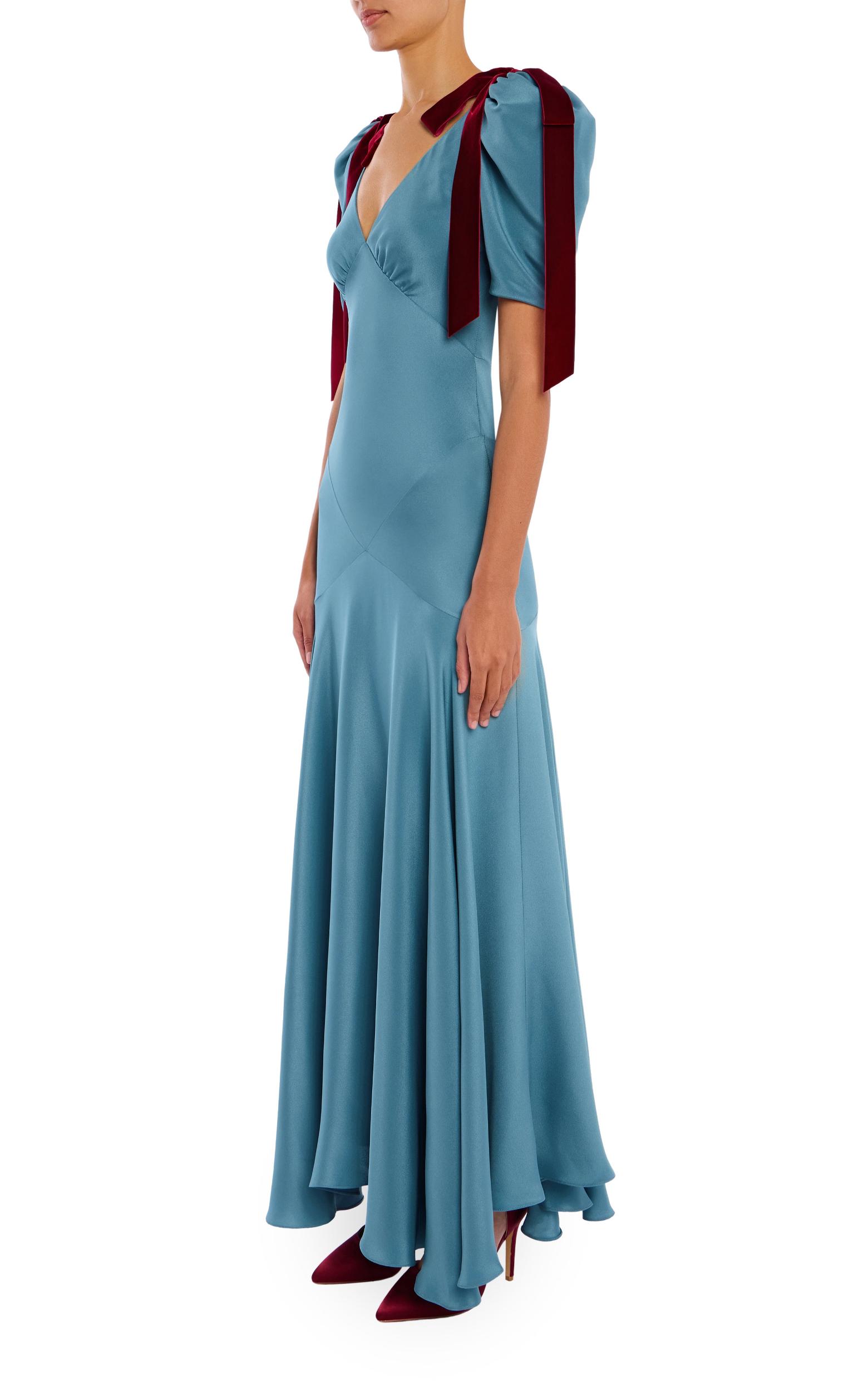 Cut from lustrous dusty blue silk two ply crepe, this bias cut gown features an inlay of cross body panels, echoed by burgundy velvet bows that tie over the puff shoulders. The empire waistline gently flares to a maxi length, and is fit to perfection. This dress is lined with a complimentary blue silk crepe.