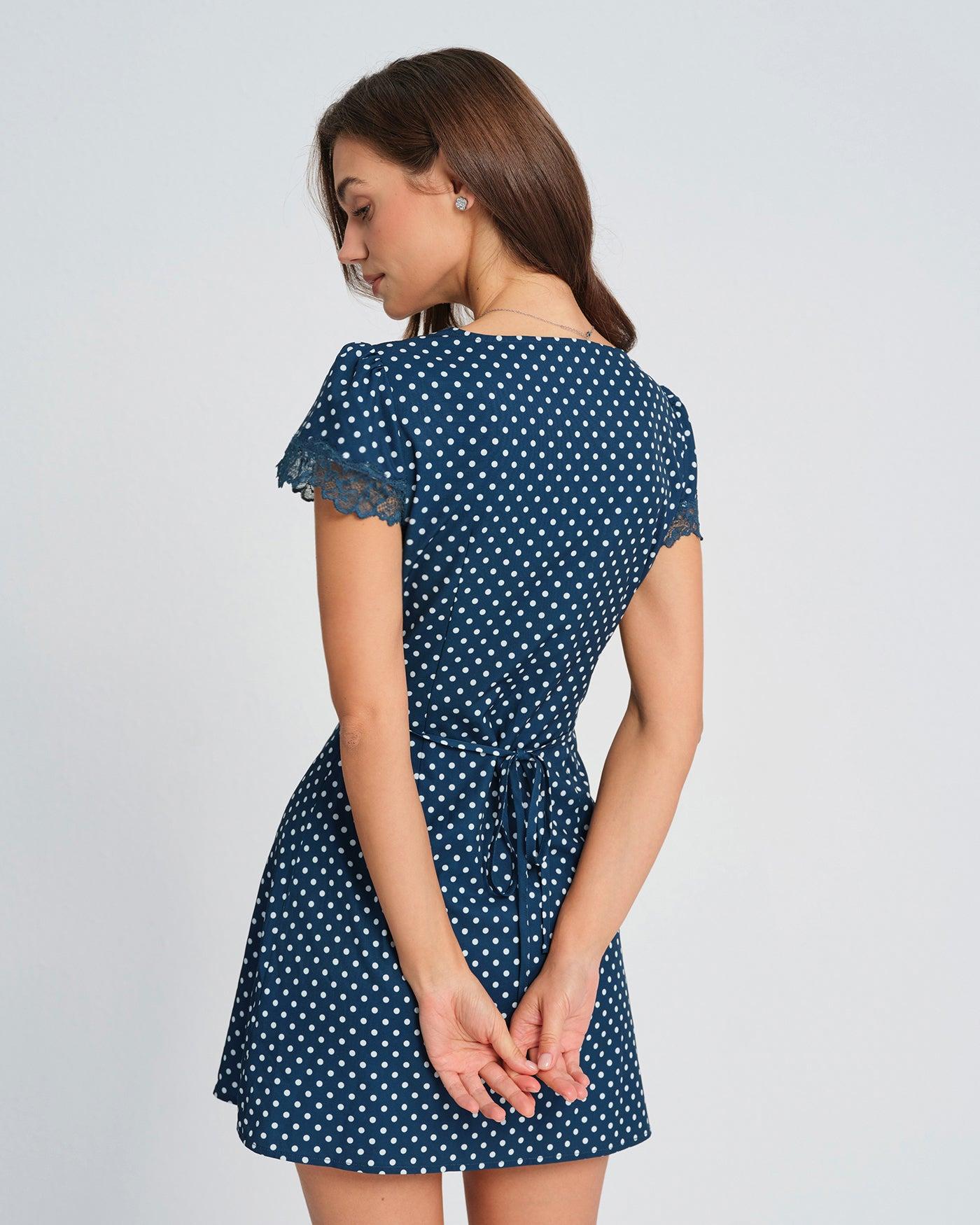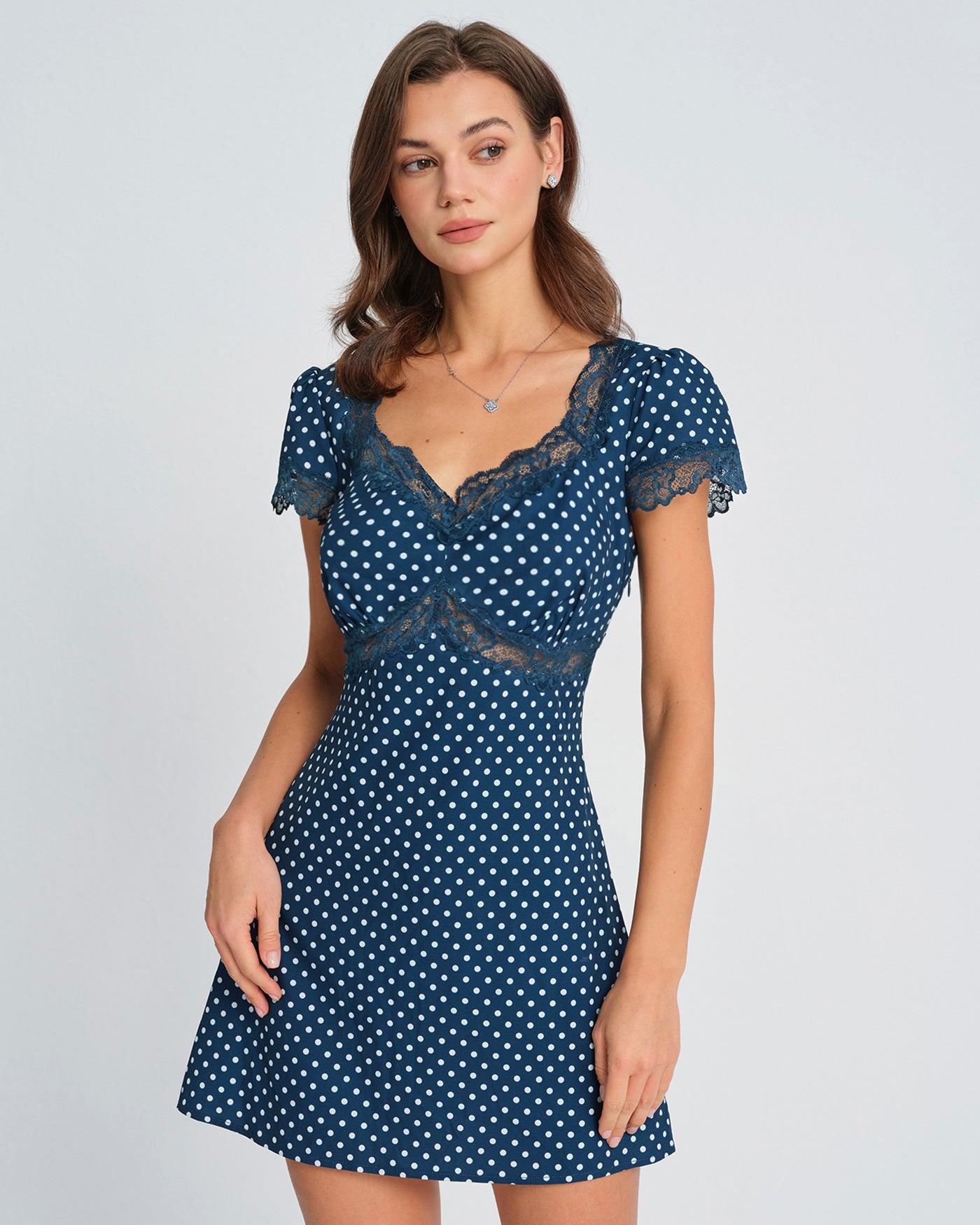 - Occasion: Daily - Style: Elegant - Season: Spring, Summer - Fabric Stretch: No Stretch - Waist: Natural Waisted - Sleeve Length: Short Sleeves - Sleeve Type: Puffed Sleeve - Pattern Type: Polka Dot - Embellishment: Splicing, Lace - Neckline: V Neck - Dress Type: Tunic - Silhouette: A-Line - Fabric: Spandex 8.0%, Recycled Polyester 92.0% - Material: Polyester