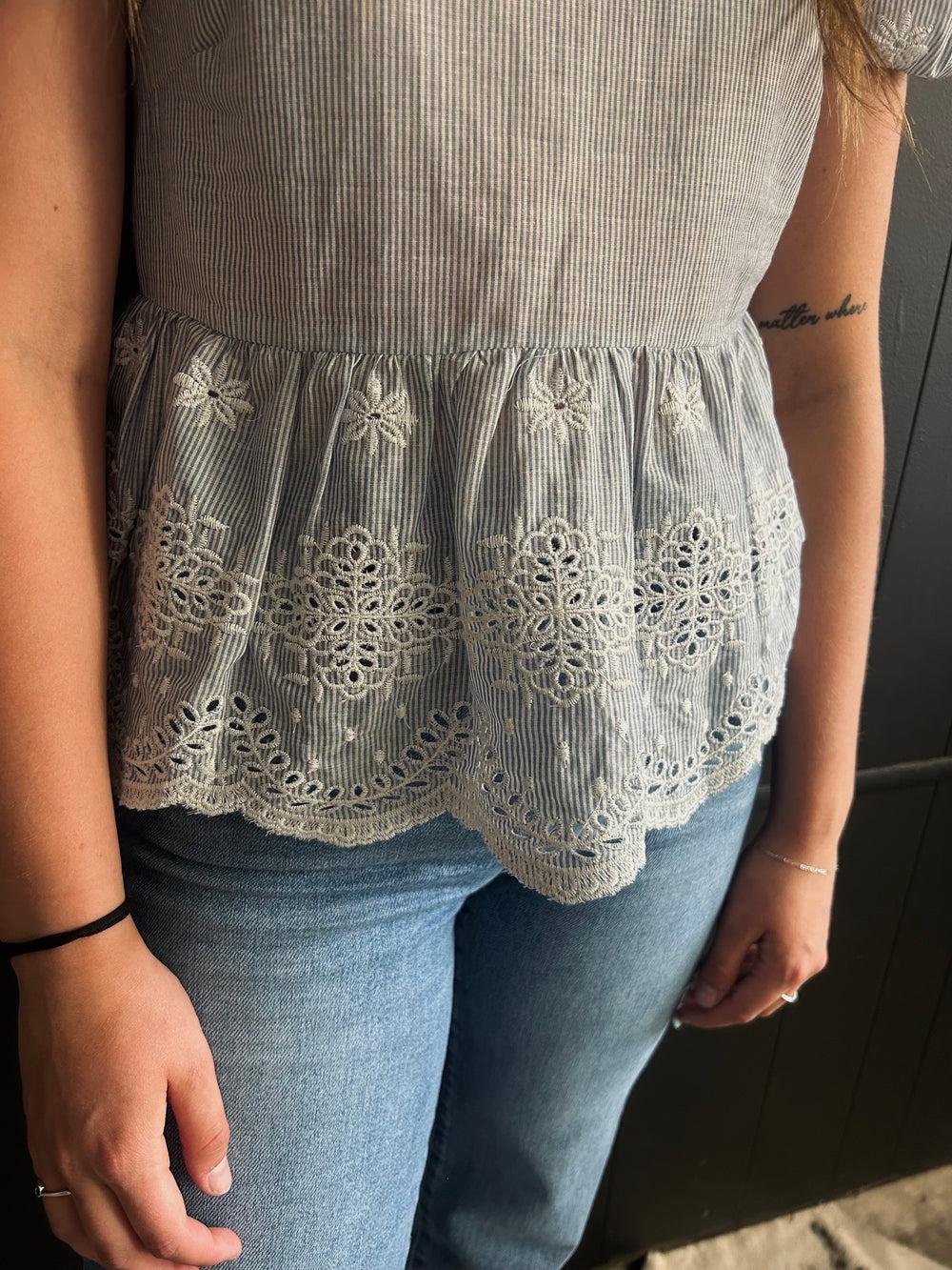 Blue & White Pin Stripe Floral Embroidered Top*