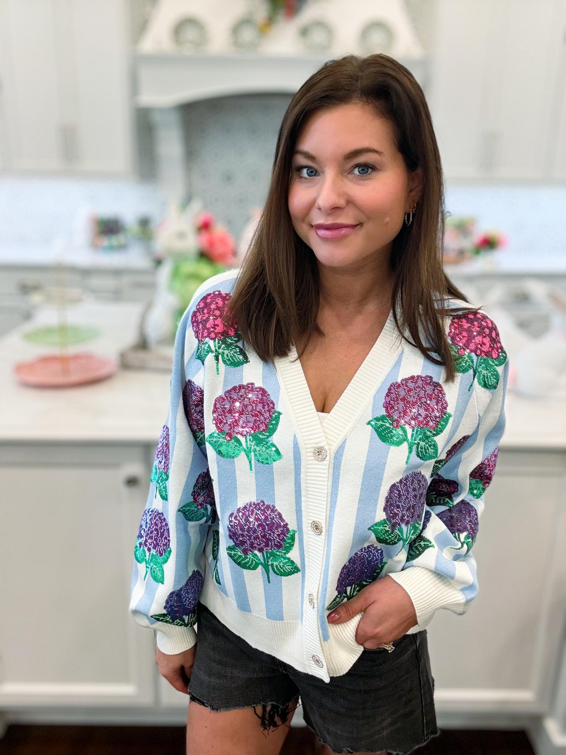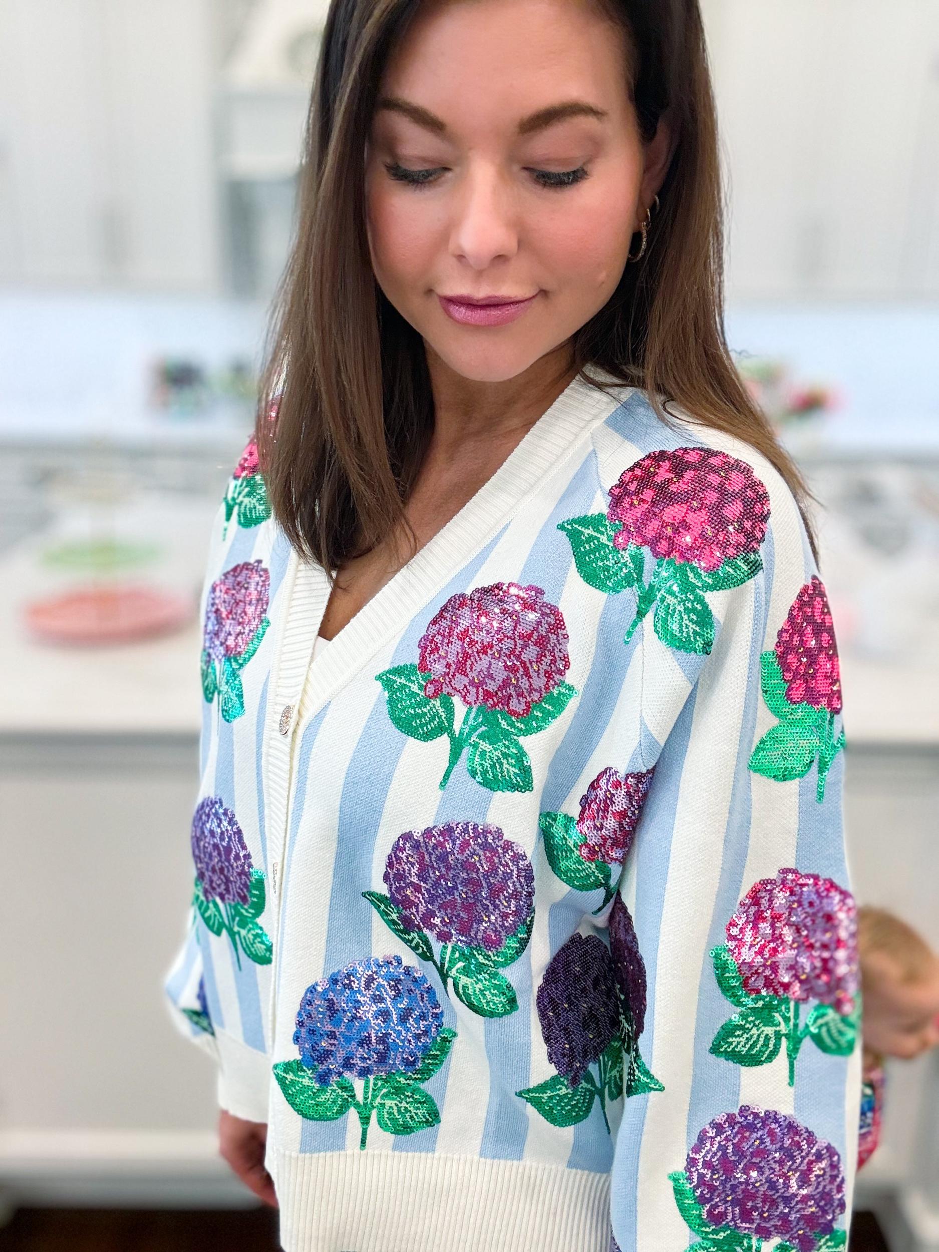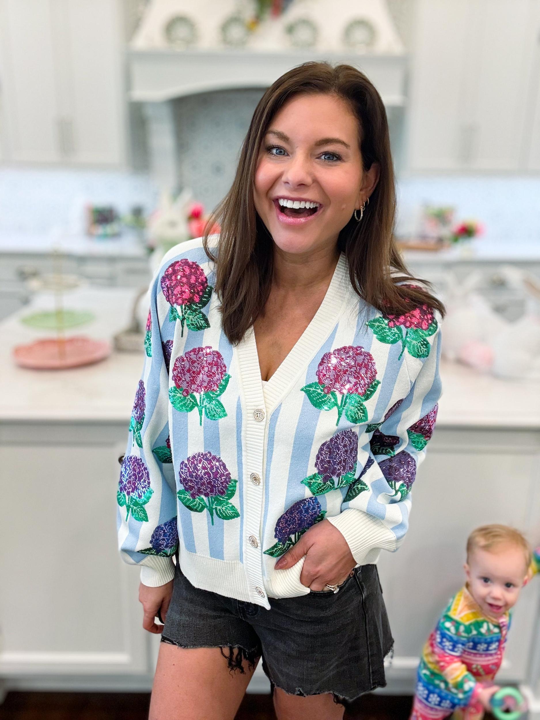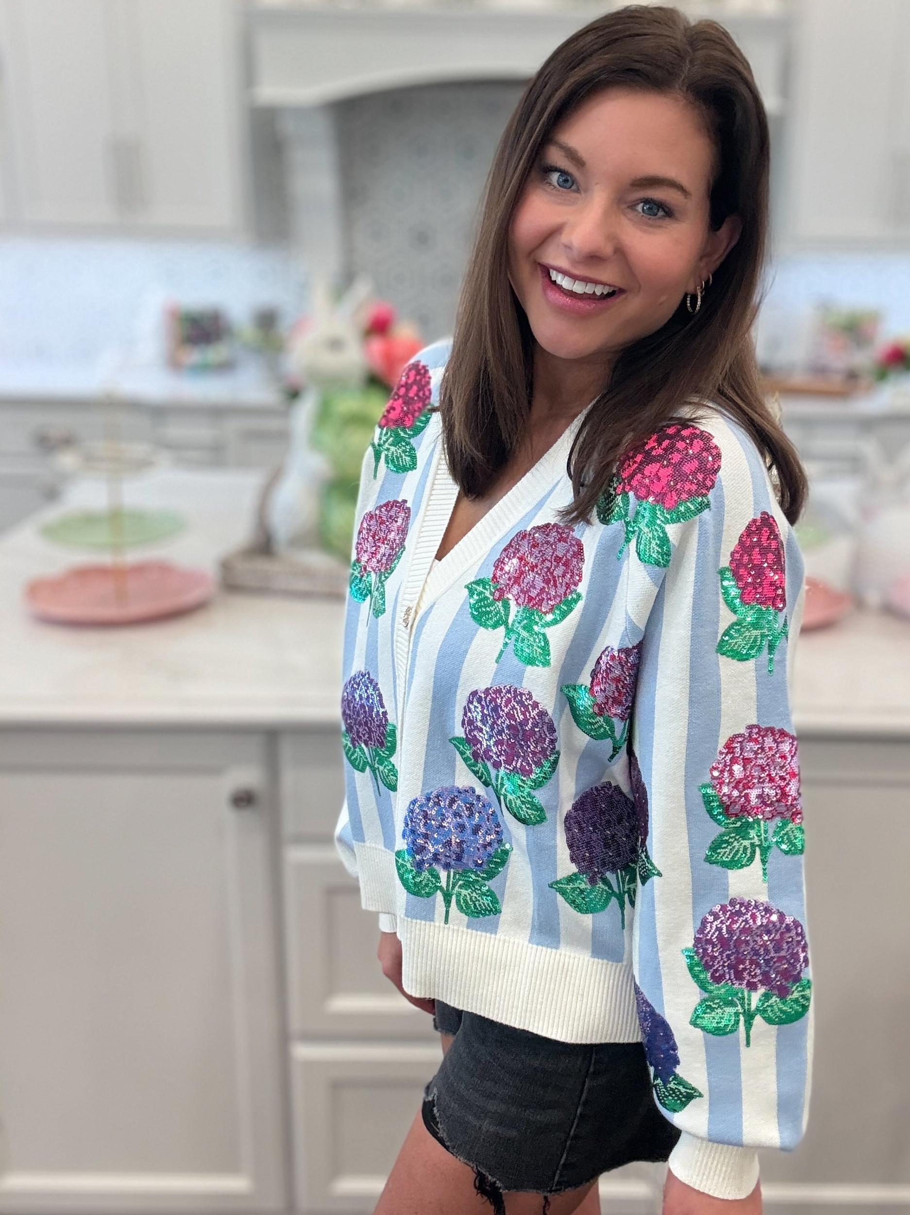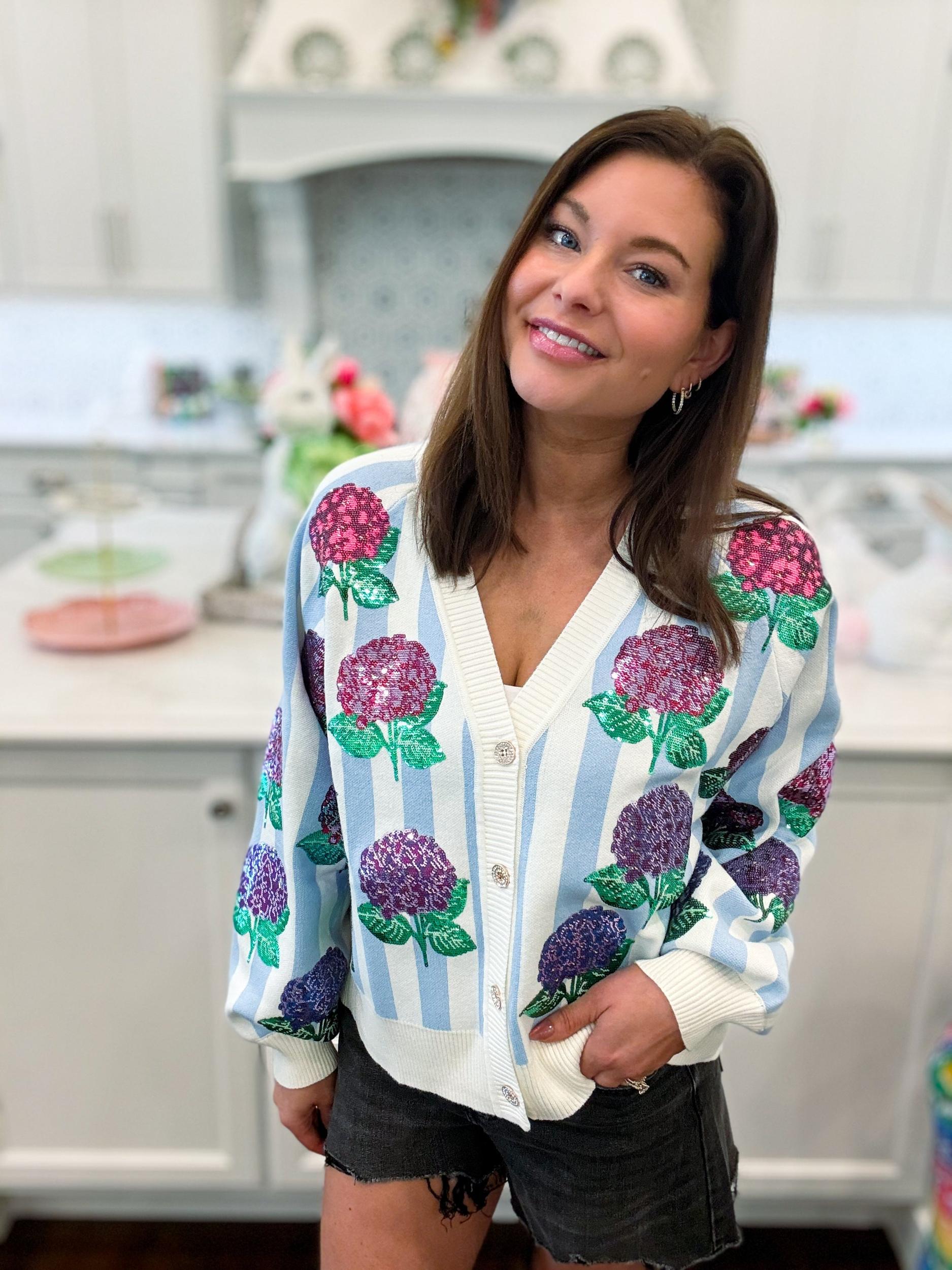 This Queen of Sparkles cardigan is the perfect addition to your spring wardrobe! With blue and white stripes and a sequined hibiscus, you'll be the talk of the town. Stay stylish and sparkly with this fun and playful piece. (Queen of Sparkles not included!)