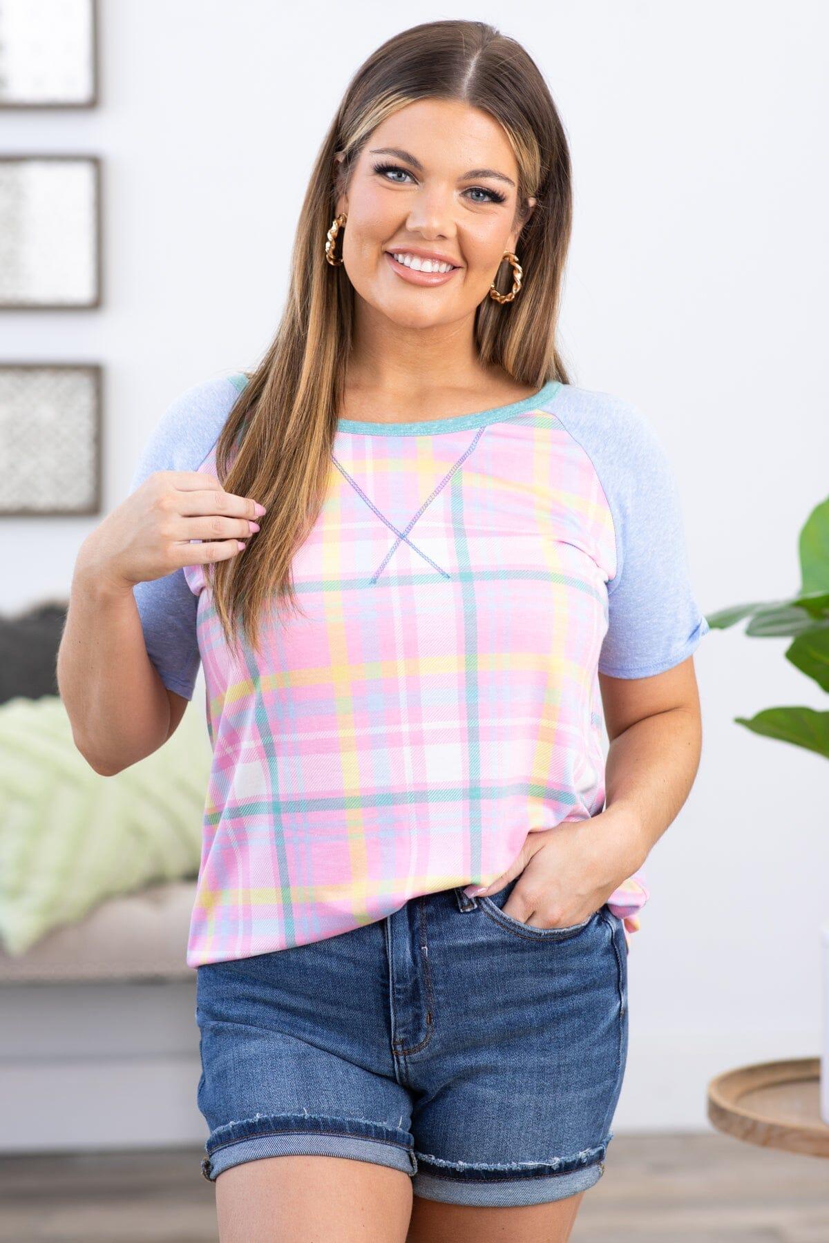 Product Details Colors: Blush, Pastel Blue, Light Teal, Off White, Yellow Print: Collar: Round Sleeve: Short Sleeves Hemline: Straight Color Season: Summer Material and Care Self: 15% Rayon 82% Polyester 3% Spandex Contrast: 50% Polyester 38% Cotton 12% Rayon Hand Wash Cold Hang/Line Dry Size and Fit Small: Bust 38" Waist 40" Front Length 27" Back Length 28" Medium: Bust 40" Waist 42" Front Length 27.5" Back Length 28.5" Large: Bust 42" Waist 44" Front Length 28" Back Length 29" X Large: Bust 44" Waist 46" Front Length 28.5" Back Length 29.5" Model is 5'4 and wearing a size small