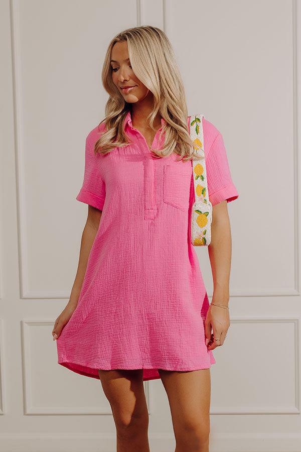- Embrace sunny style with this cutie! With its relaxed fit and effortless charm, this adorable mini dress is perfect for boardwalk strolls, lakefront adventures, and all your laidback plans. - Subtly textured material - A built-in lining - A collared v-cut neckline - A buttoned bodice ending above the waistline - A functional chest pockets - Short sleeves with rolled cuffs - A relaxed silhouette that ends in a straight, mini dress length hemline