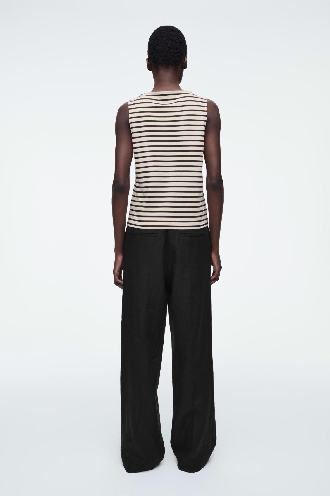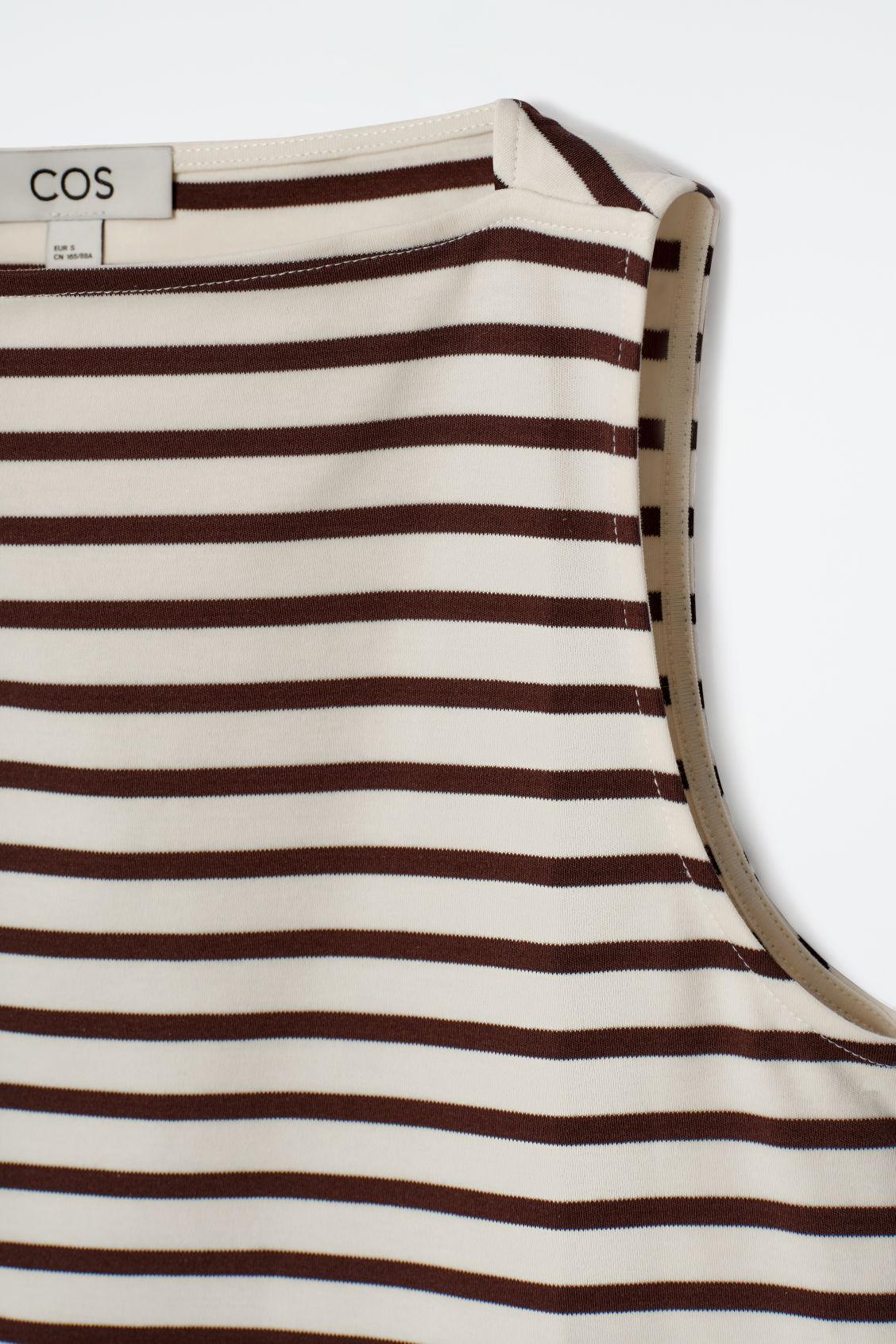 Modern signatures like this tank top are unmistakably COS. Crafted from soft cotton-jersey, it's shaped with a wide boat neckline, tonal topstitching and a subtle racer back silhouette. The chocolate and ivory stripes lend further dimension. Regular fit Shell: 100% Cotton. Excluding trims / Machine wash Back length of size S is 63cm / Model wears a size S