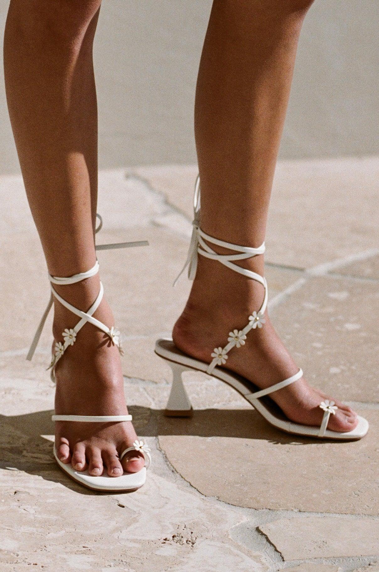 A fun way to dress up your look! The Bobbi Heels are an open toe style made from a white vegan leather featuring a vintage style heel, strappy details across foot with daisy embellishments and a toe strap. Exclusively designed by Sabo.