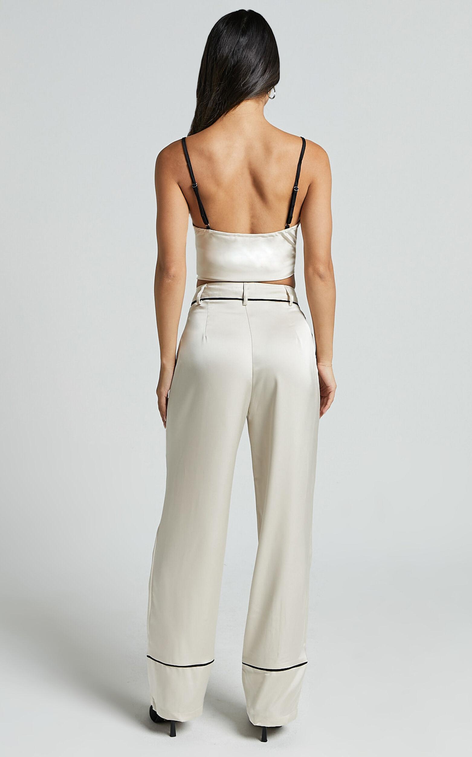 Stand out from the crowd in our Bobbie Pants - High Waist Contrast Piping Pants In Oyster. These elegant white pants are perfect for any party night, with their high waist and full-length design adding a touch of sophistication to your look. Made from a mid-weight woven polyester fabric, these relaxed pants offer both comfort and style. The contrast piping detail along the sides adds an extra pop of interest, making them a statement piece that will turn heads wherever you go. Step into these Bobbie Pants and embrace your empowered self as you conquer the dance floor or social event of your choice!Product Details:Zips and pocketsRelaxed pant styleMid weight wovenFull length cutPolyester materialMid waist designPerfect for partiesSize and FitSize S / 8 length: 108cm / 42.52inMaterial and Care100% PolyesterNo Stretch