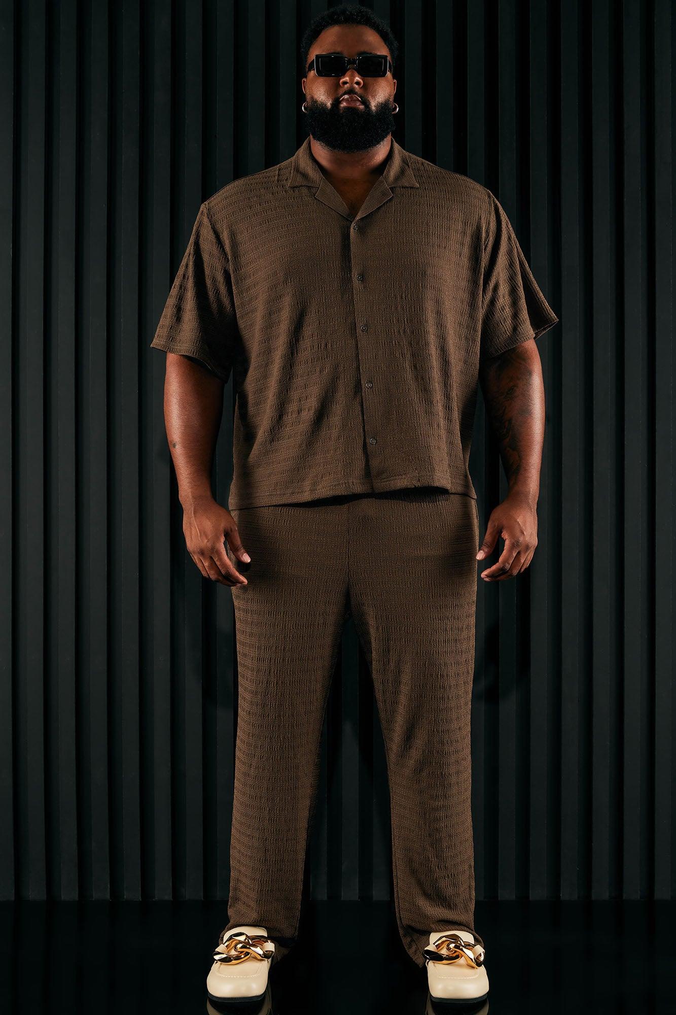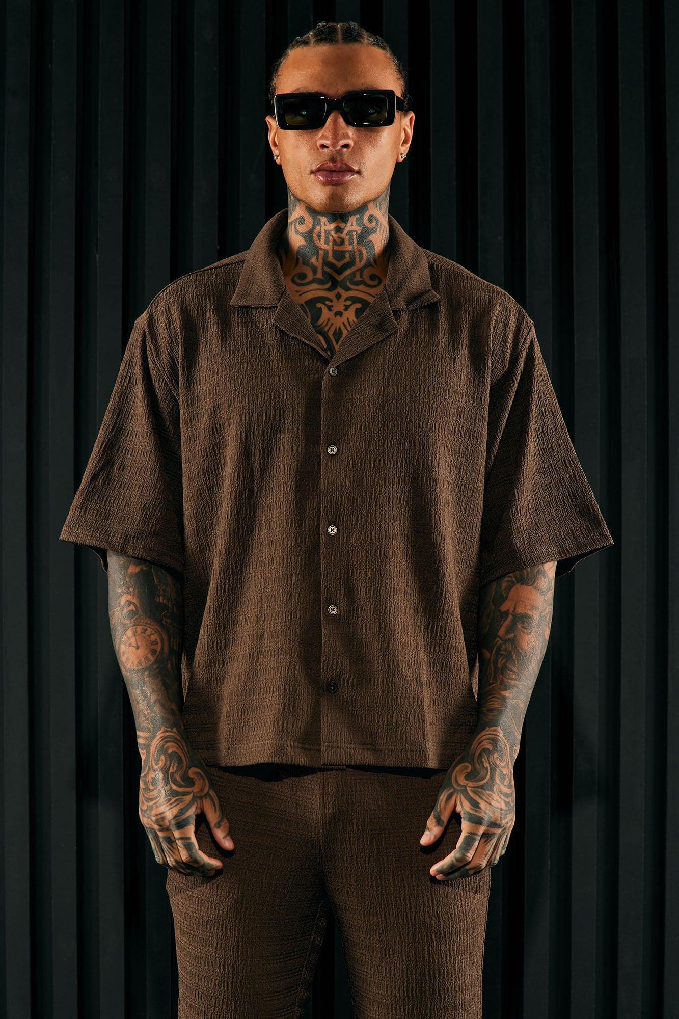 Available In Brown. Fold Down Collar Front Button Closure Short Sleeve Pair With "Boca Basket Ball Shorts" Or "Boca Slim Pants" 98% Polyester, 2% Spandex Imported California Proposition 65 WARNING: Cancer and Reproductive Harm - www.P65Warnings.ca.gov.