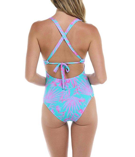 From Body Glove, this one piece swimsuit features: Texture fabrication Bandeau silhouette V-wire neckline Removable soft cups 2-way tie back Front cut-out detail Medium coverage Lined Pull-on construction Polyester/spandex Hand wash Imported.