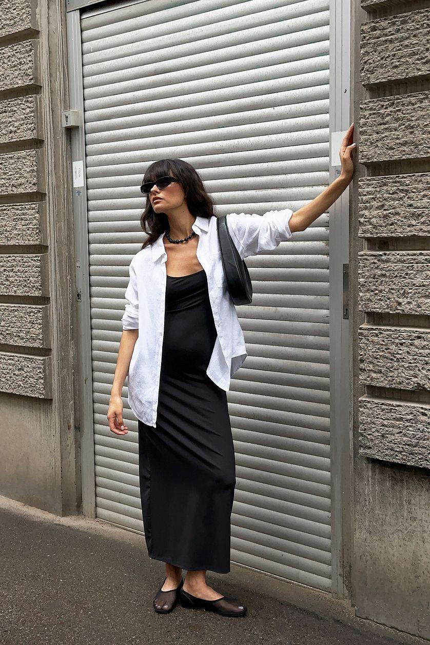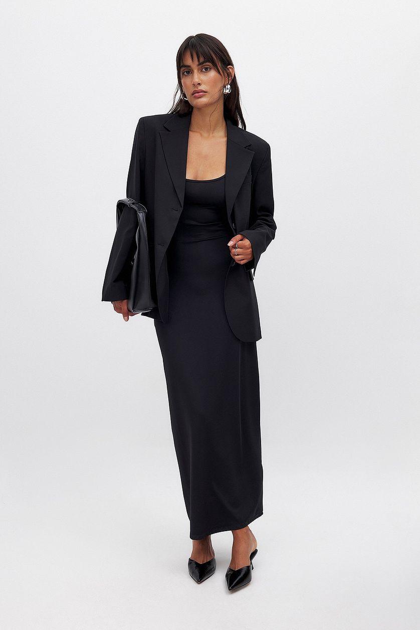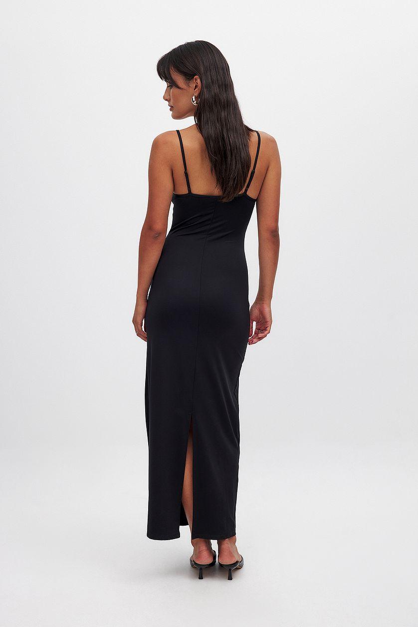 This maxi dress features a form fit and a smooth stretchy material. It has thin, adjustable shoulder straps and a back slit detail.