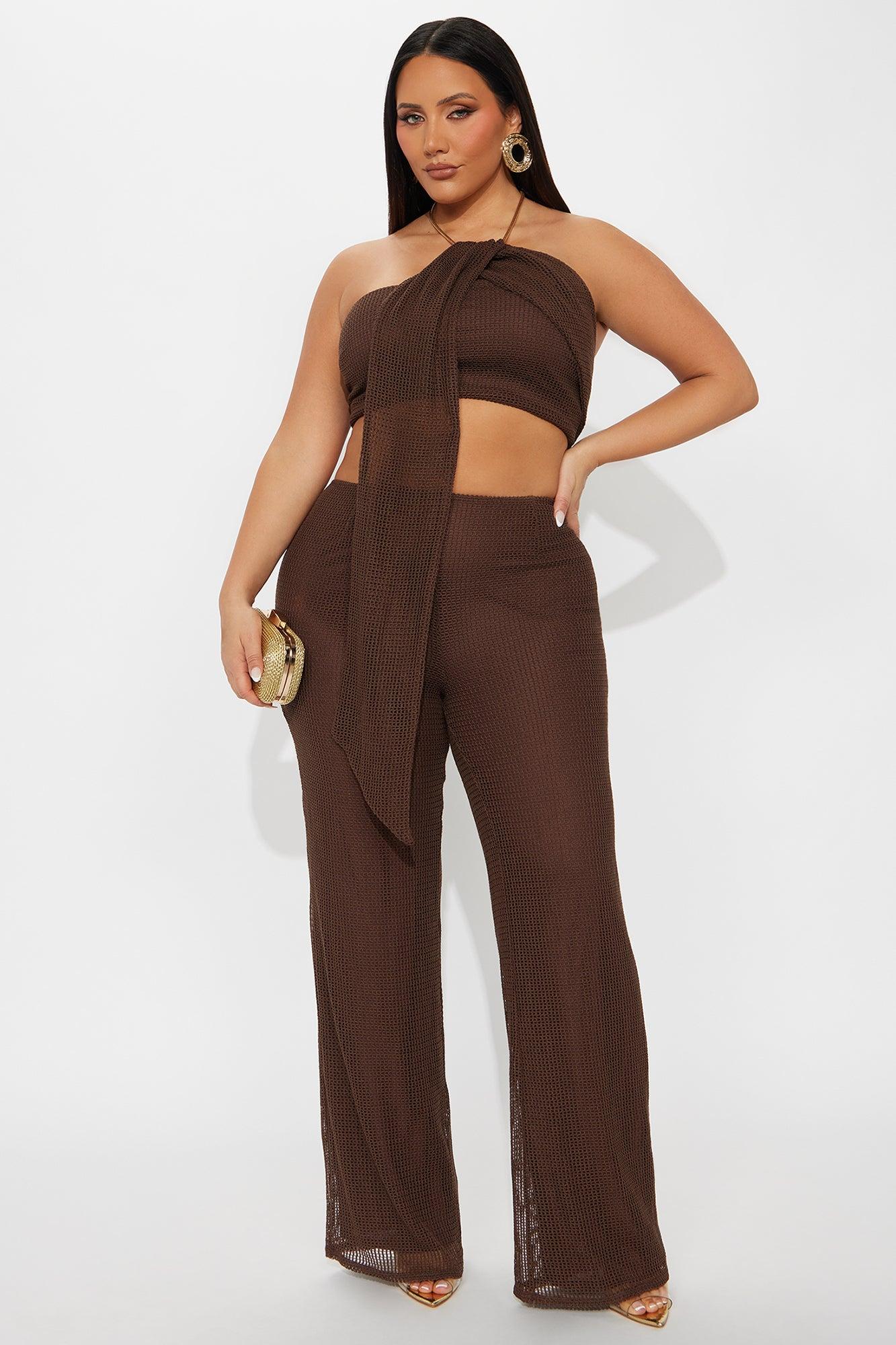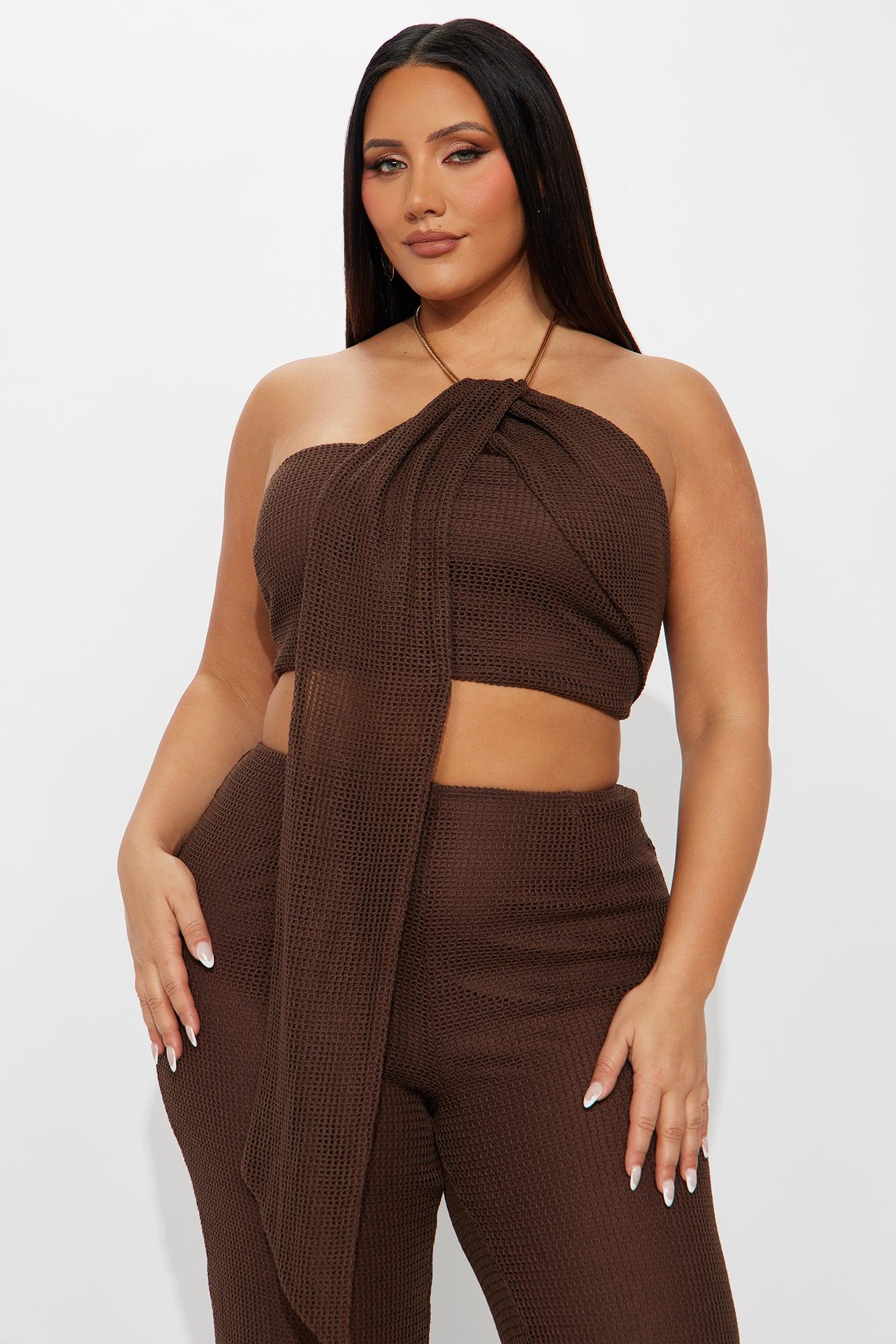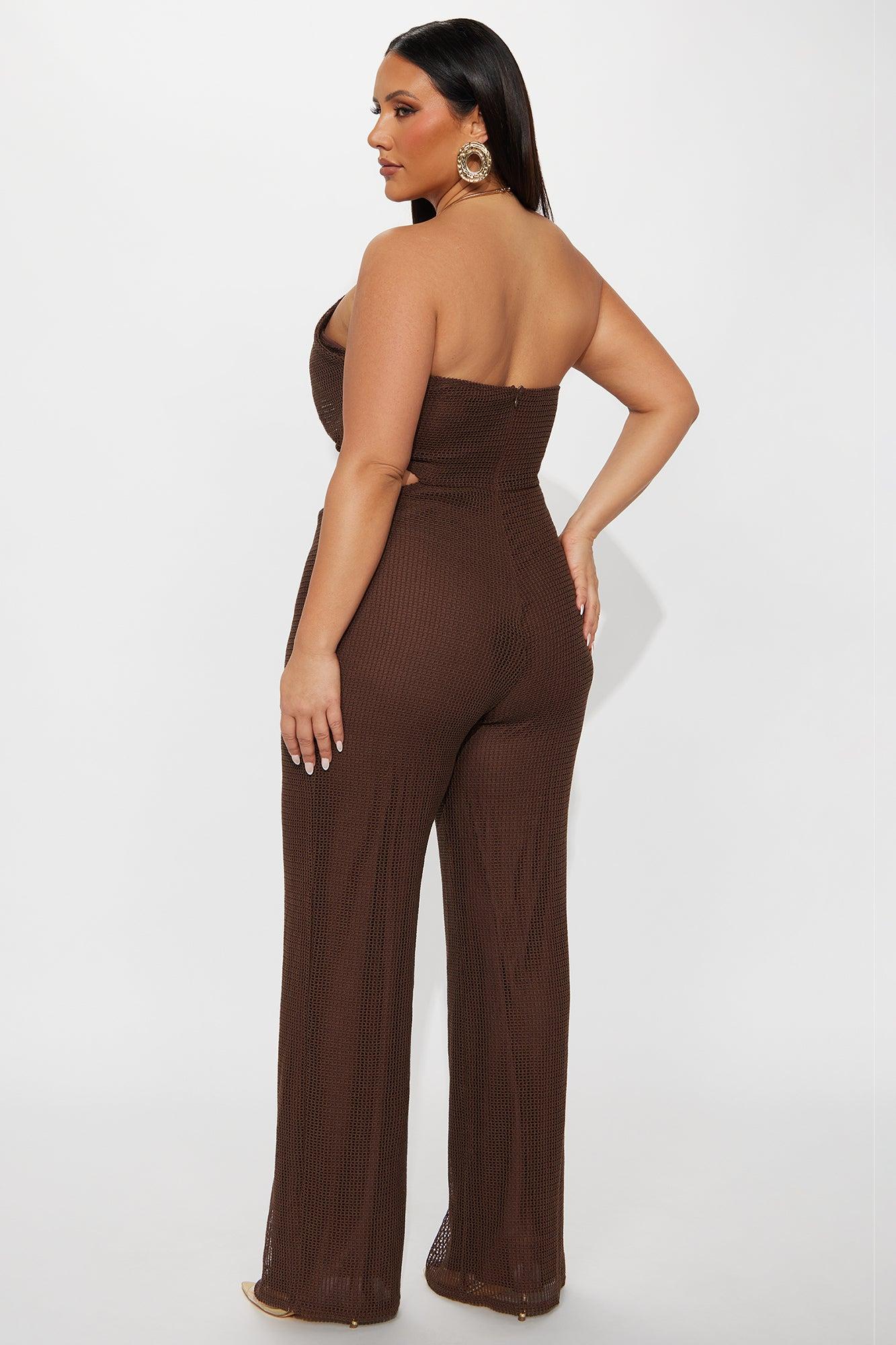Available In Chocolate. Crochet Jumpsuit Chain Halter Detail Cut Out Back Zipper Lined Inseam = 34" Self: 85% Polyester 15% Cotton Lining: 100% Polyester Imported California Proposition 65WARNING: Cancer and Reproductive Harm - www.P65Warnings.ca.gov.
