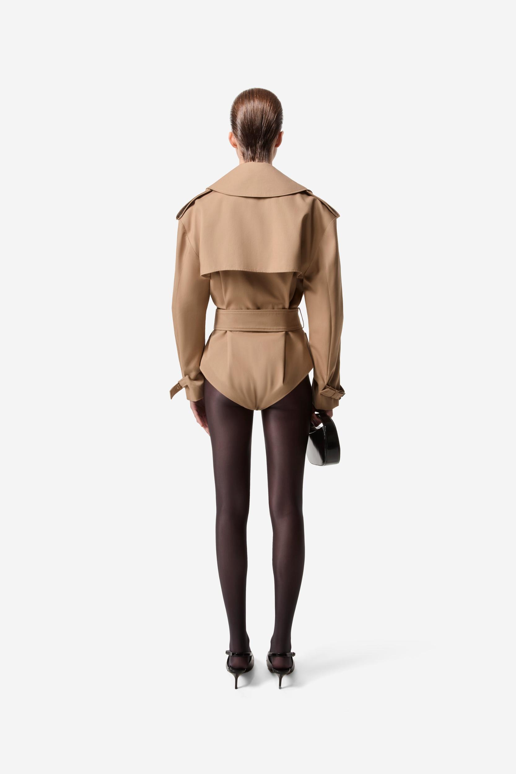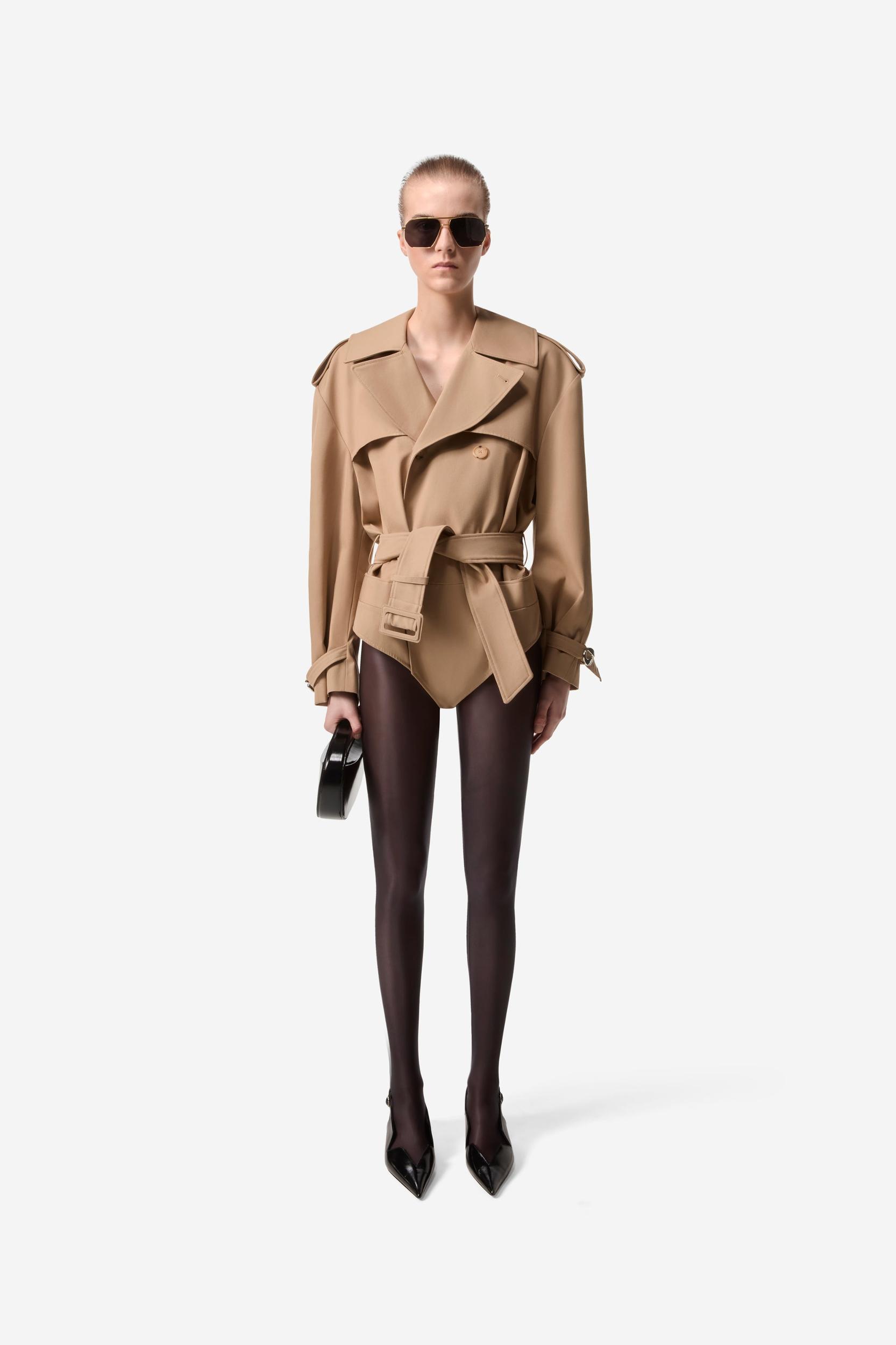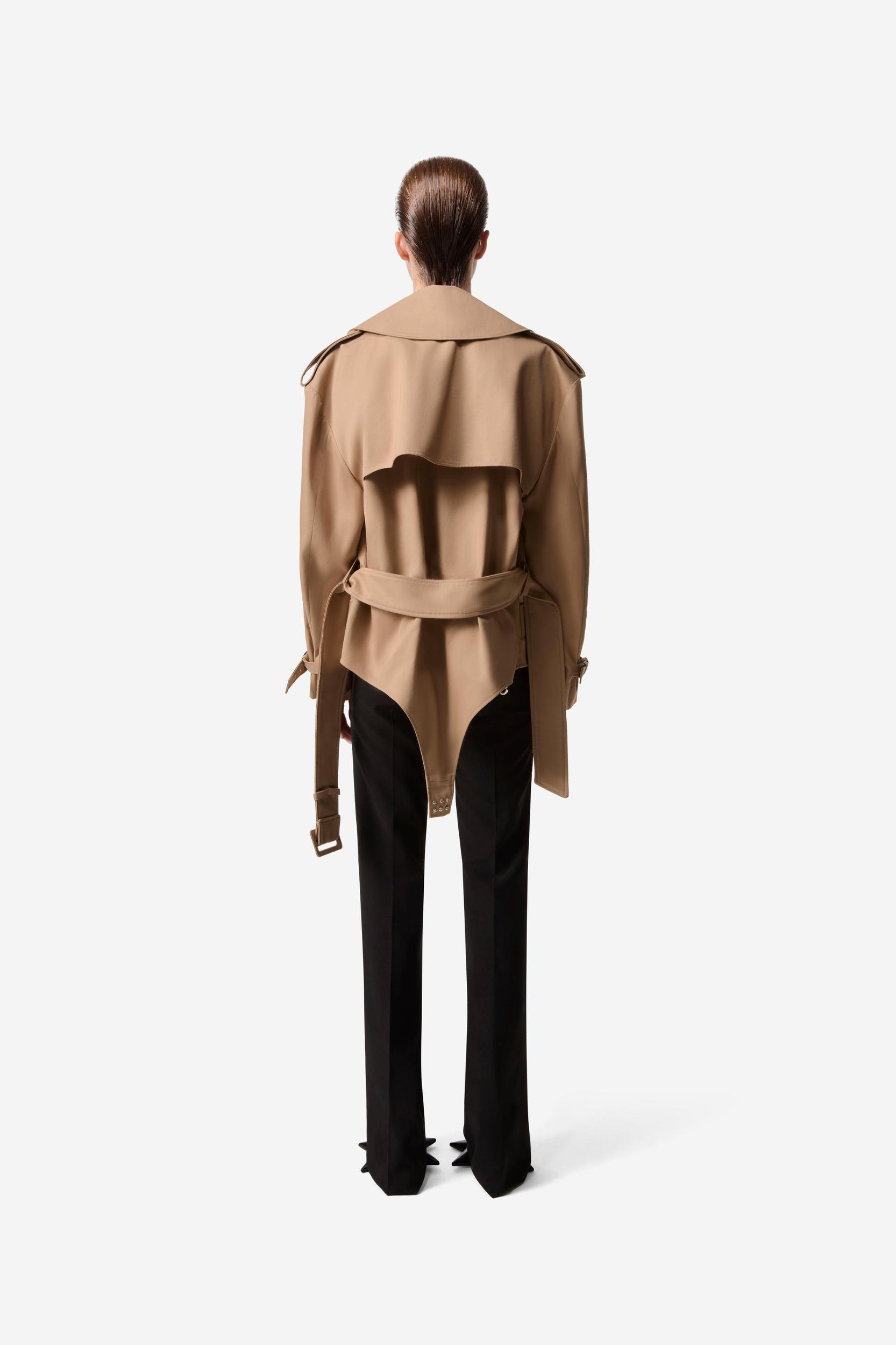 A fusion of classic and futuristic, this piece has a top half inspired by a traditional trench coat complete with storm flaps, epaulettes and generous drop sleeves secured at the cuffs with straps decorated with silver C logo buckles. The jacket cinches as the waist with a belt and is cut high on the hips to complete this one-piece look, which can be worn on its own or over trousers. The lower body section can also be removed to create a waist length jacket.