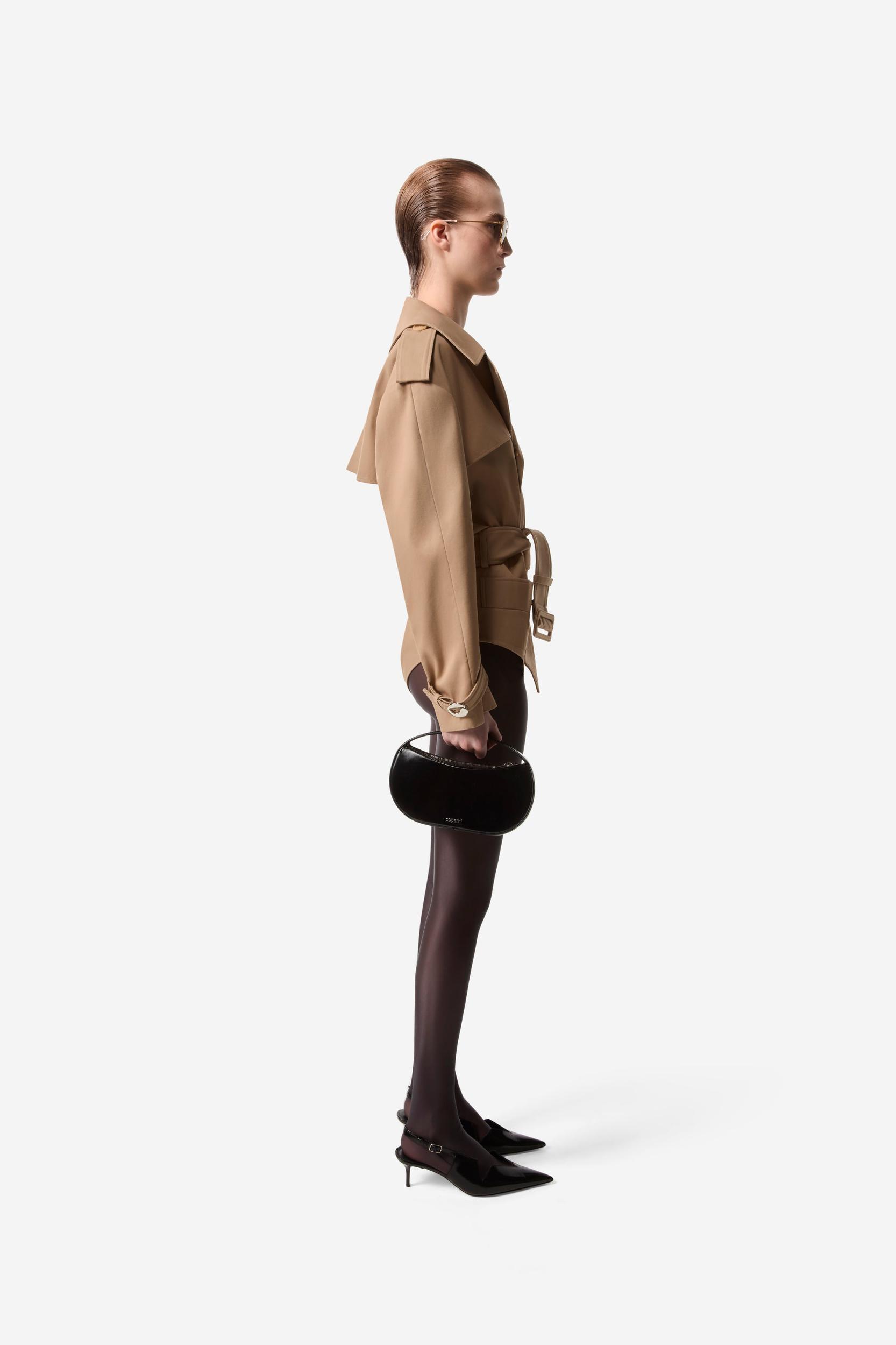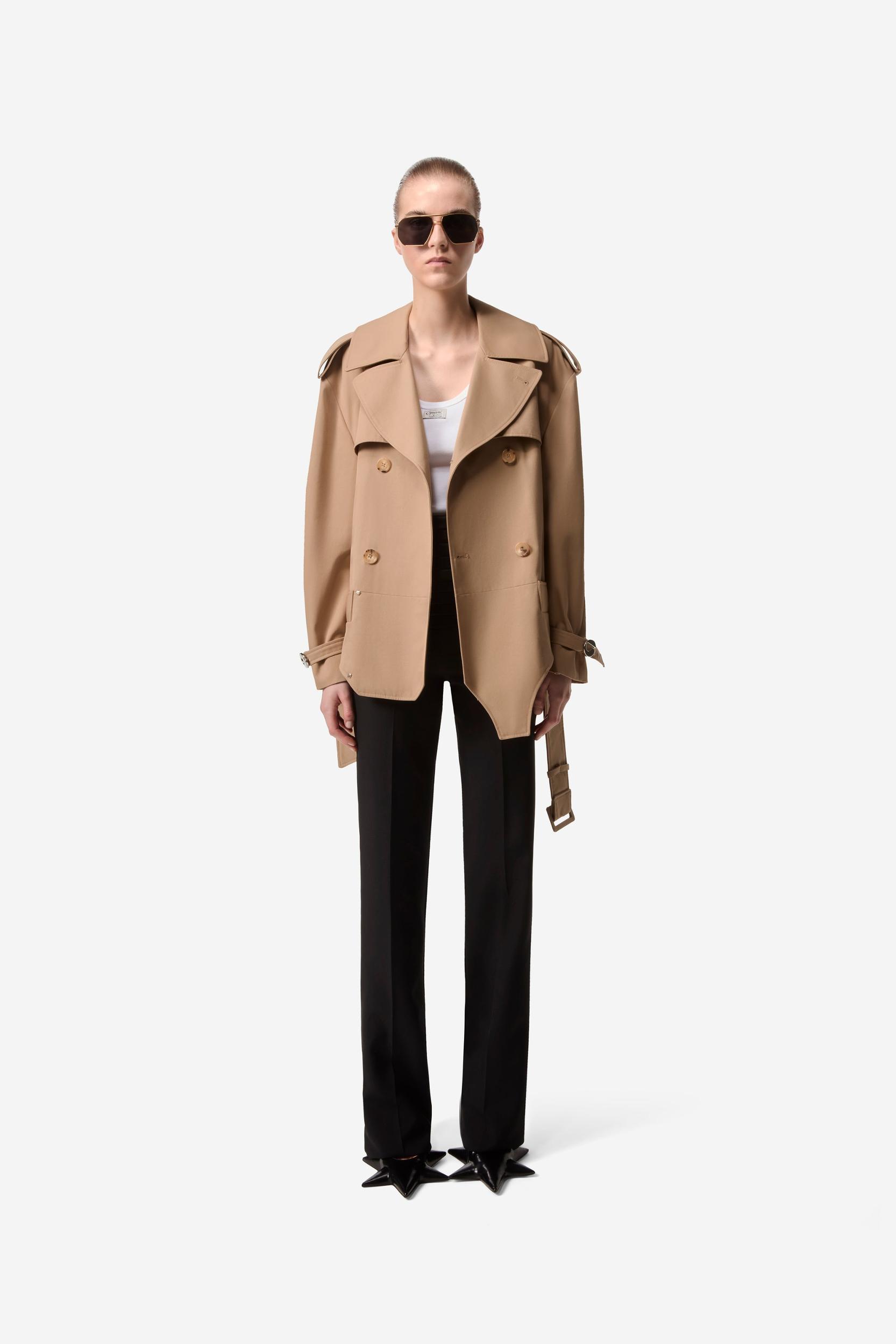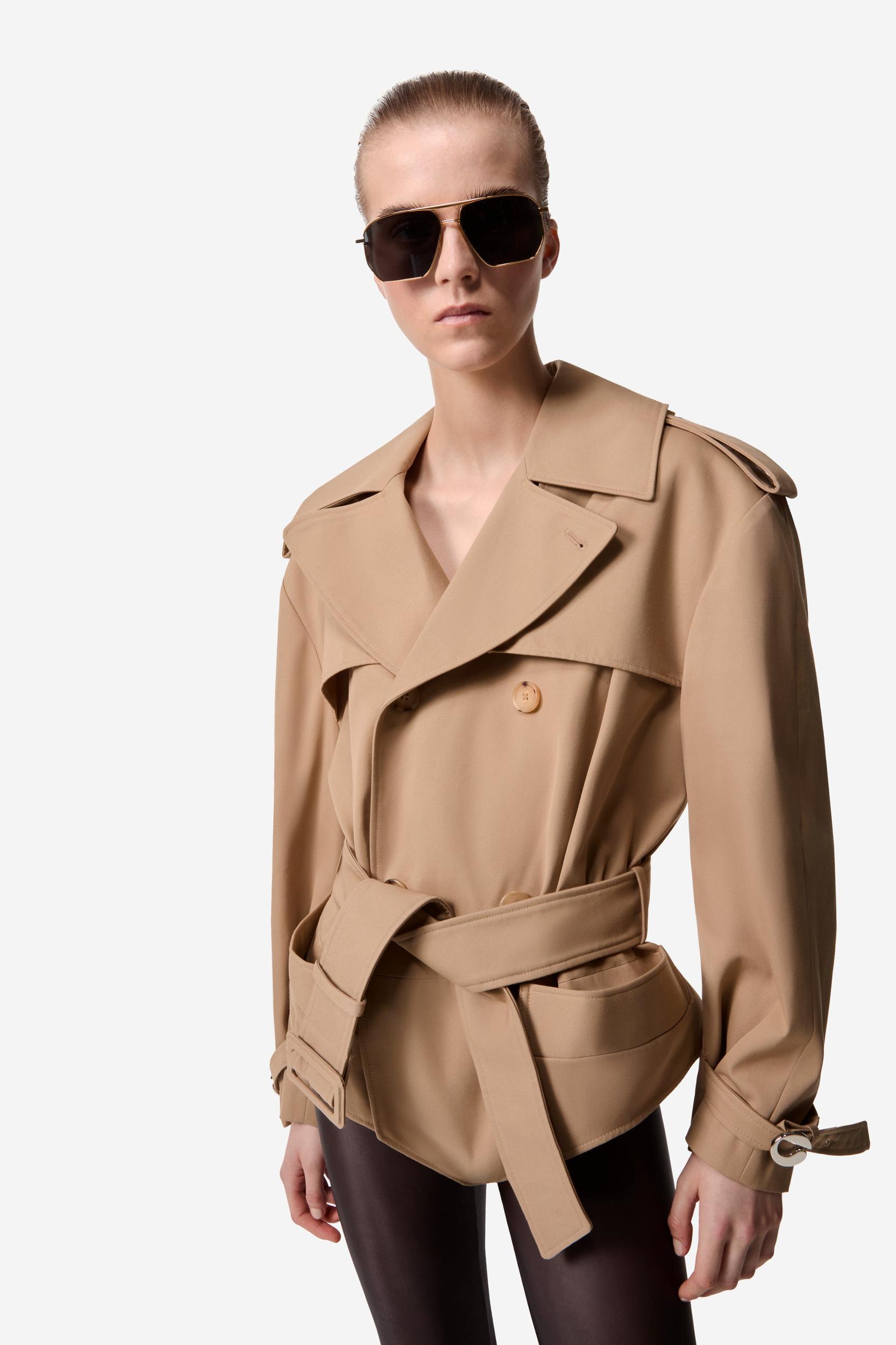 A fusion of classic and futuristic, this piece has a top half inspired by a traditional trench coat complete with storm flaps, epaulettes and generous drop sleeves secured at the cuffs with straps decorated with silver C logo buckles. The jacket cinches as the waist with a belt and is cut high on the hips to complete this one-piece look, which can be worn on its own or over trousers. The lower body section can also be removed to create a waist length jacket.
