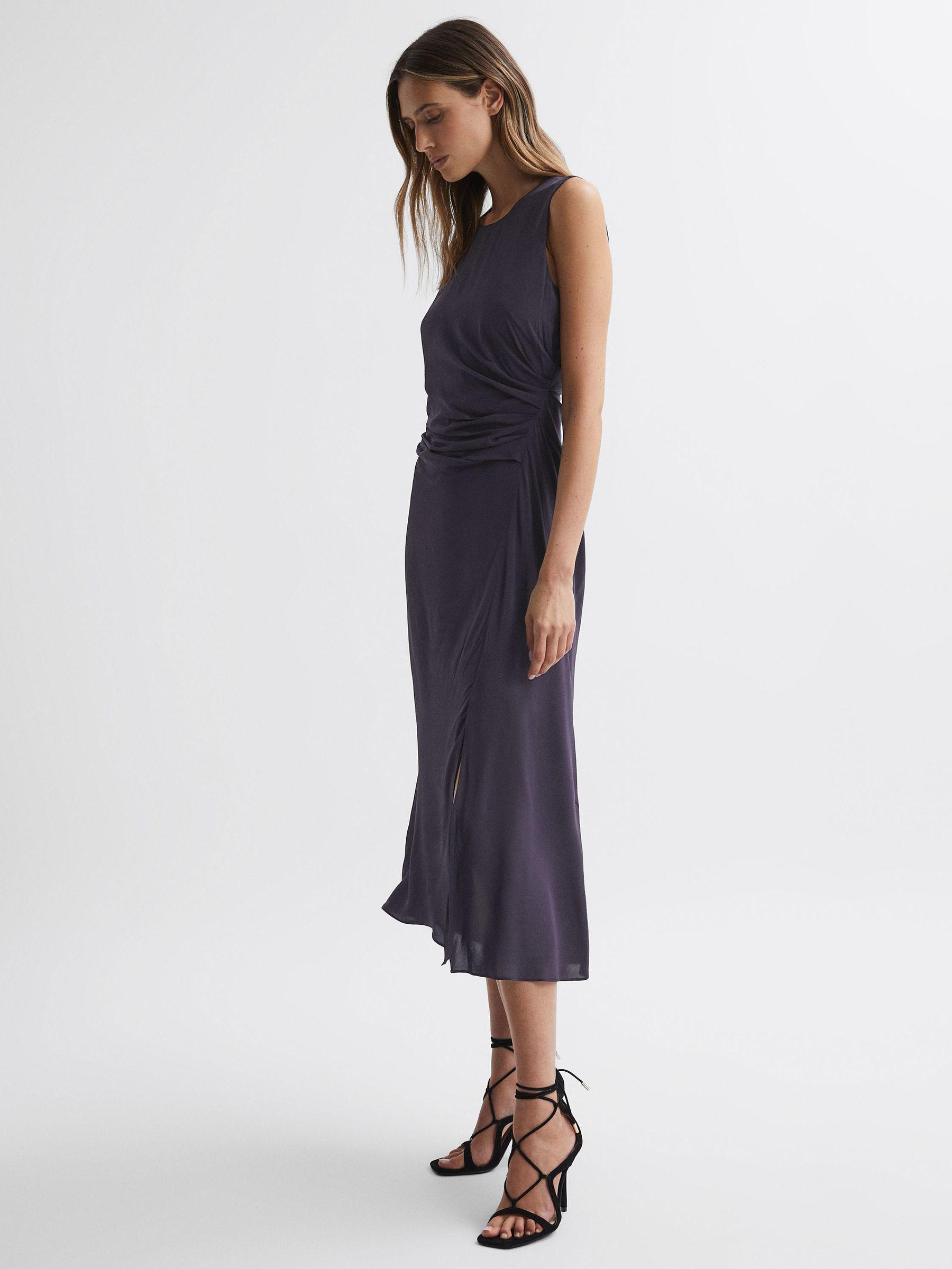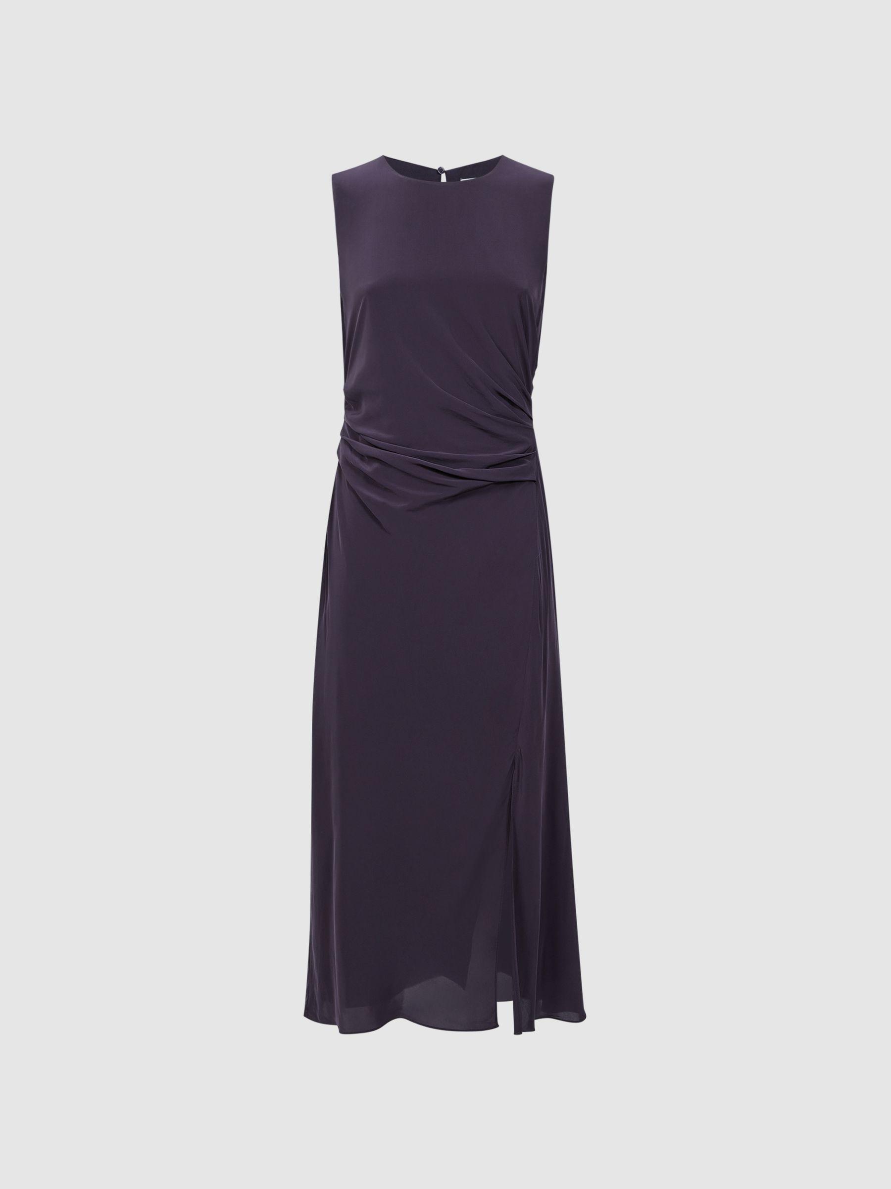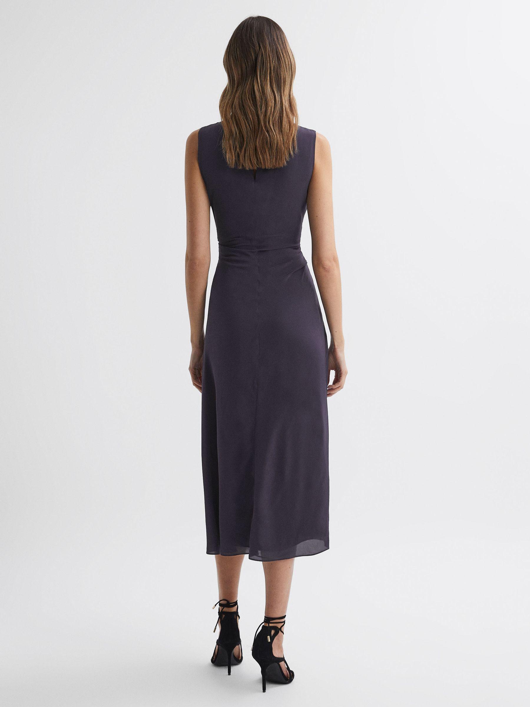 Choose the Lexi midi dress in grape for a confident edit. It’s designed in a bodycon fit and features ruche detailing to the side, accentuating the natural figure. A front slip is added for enhanced movement, and subtle allure. Style tonally. Ruched detailing. Round neckline. Sleeveless. Midi length. Front slip. Bodycon fit. The model is wearing a size 8. Measurements of model: Height 5ft 10" / 178cm.