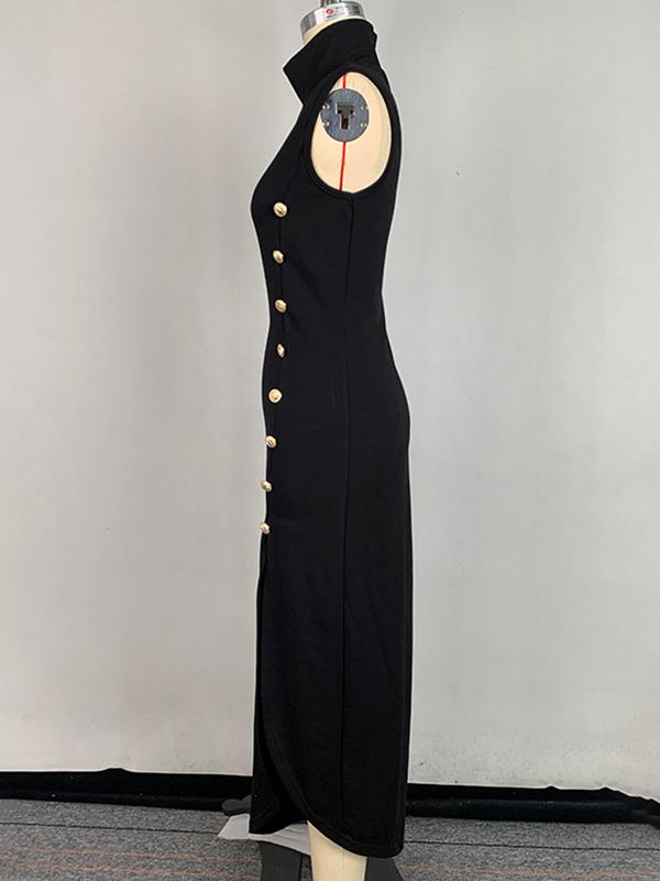 Bodycon Sleeveless Buttoned Solid Color Split-Side High Neck Maxi Dresses