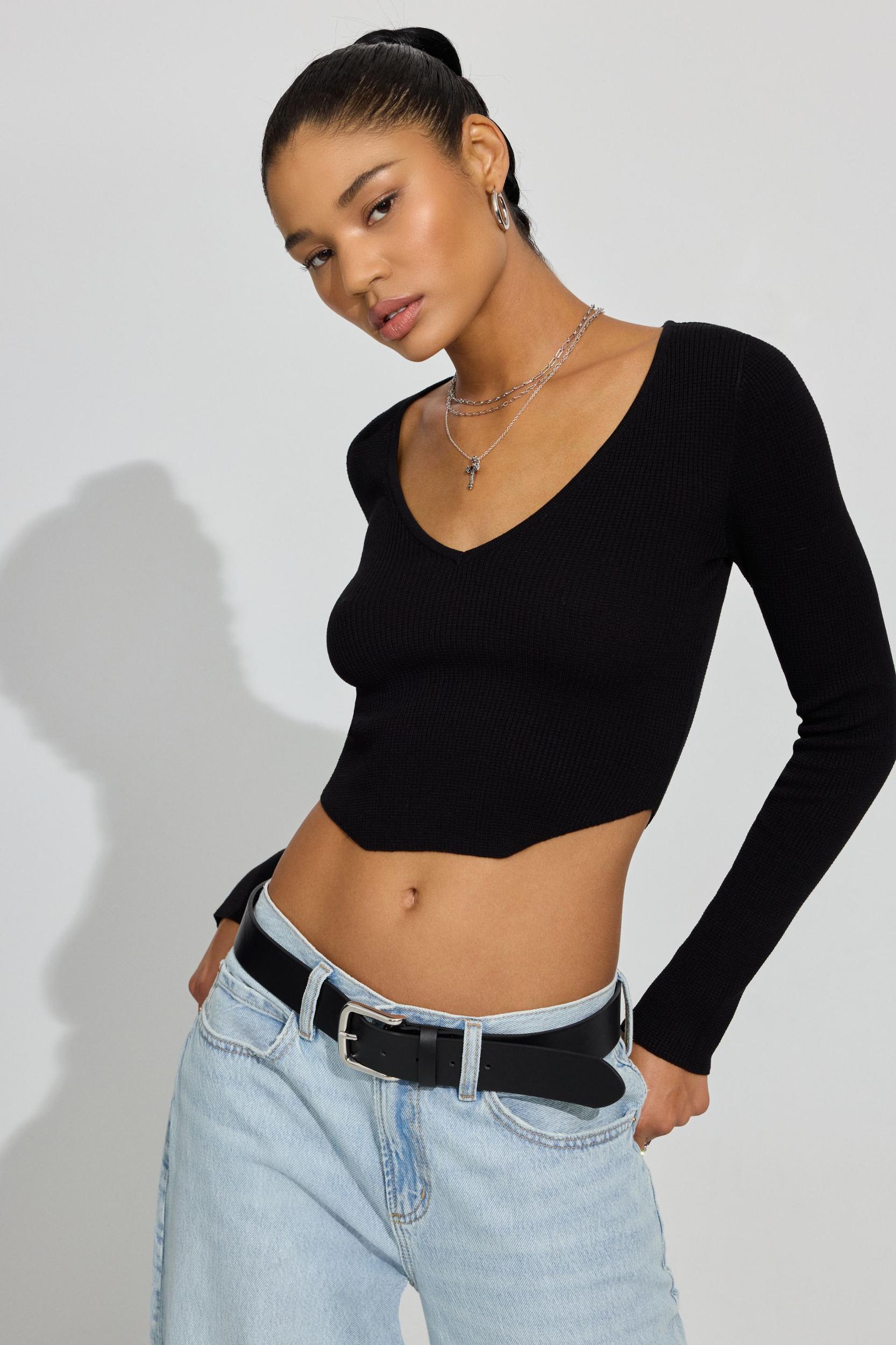 This hem is giving! Can you say flattering? Features V-neck Rib knit Corset-style hem Size & Fit Fit: Fitted Length: Cropped Model is wearing size S Materials & Care Content: 70% viscose, 30% nylon Care: Machine wash, cold Imported