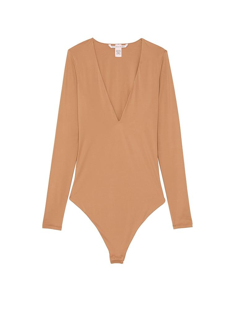 A plunging neckline adds drama to this body-hugging, supersoft piece that offers comfy, smoothing support. It gives a sleek, streamlined look when paired with your favorite bottoms. Deep V neckline Long sleeves Buttery smooth microfiber hugs your curves 4-way stretch moves with you Double-layered, wicking material keeps you cool Minimal back coverage: lots of cheek peek Cotton gusset panel with snap closures Partially made from recycled materials Machine wash Imported