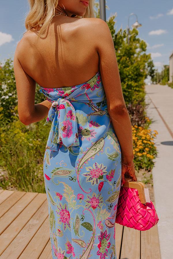 - Bring on the boho energy with this beautiful maxi! Delicate floral-paisley material and a chic strapless neckline make this dress a romantic option, perfect for a sweet date night. Be ready to capture hearts in this fabulous piece! - Lightweight material with a pink, green, and neutral hued paisley and floral print - An elastic strapless neckline with an interior non-slip strip and a back tie detail for a secure fit - A flattering silhouette that ends in a maxi length hemline with a side slit accent