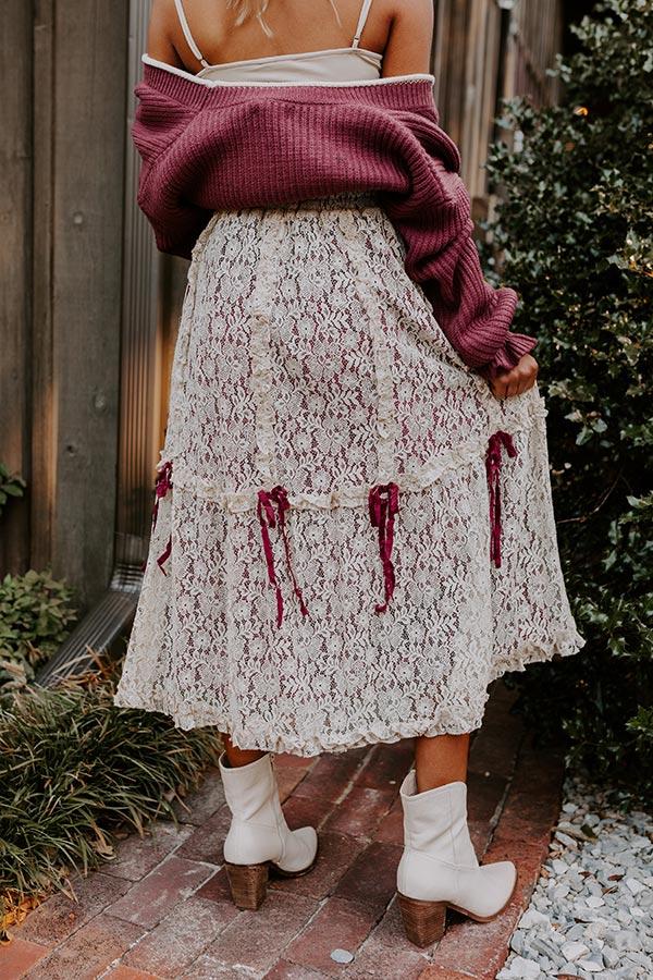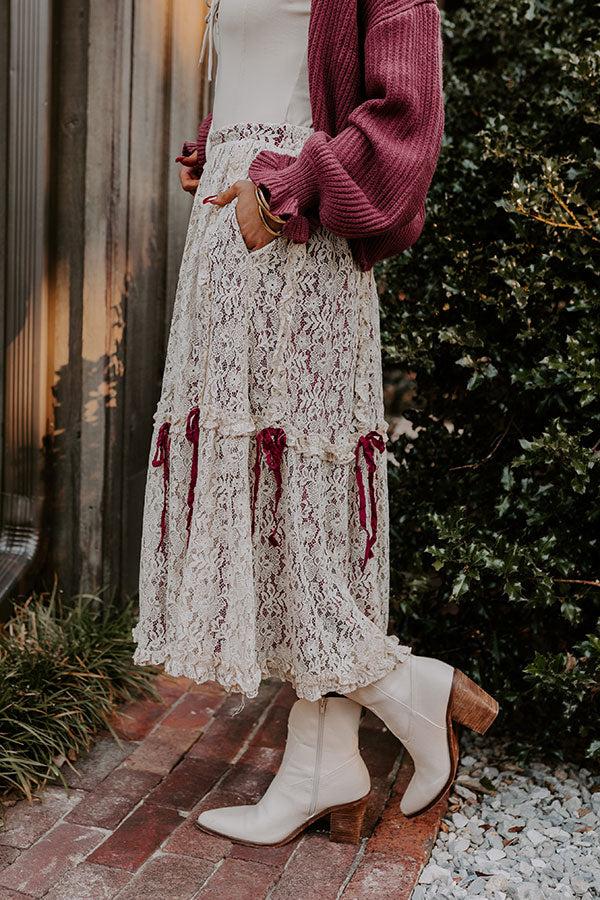 - Add a touch of romance to your look with this enchanting lace skirt! Velvet accent bows add a luxe vibe to its charming design. From elevated everyday style to seasonal celebrations, this cutie promises to keep you looking fabulous! - Lace material - A built-in velvet lining - A waistline with an elastic back - Ruffle detailing - Bow accents - Hidden side pockets - A flowy silhouette that ends in a ruffled, maxi length hemline