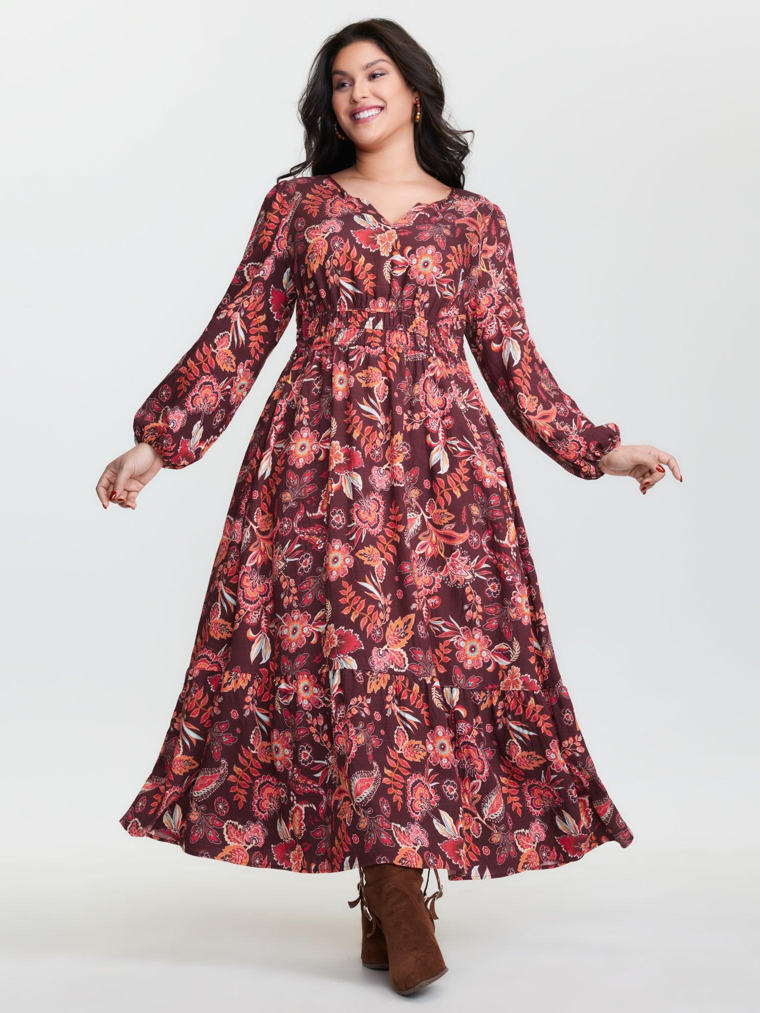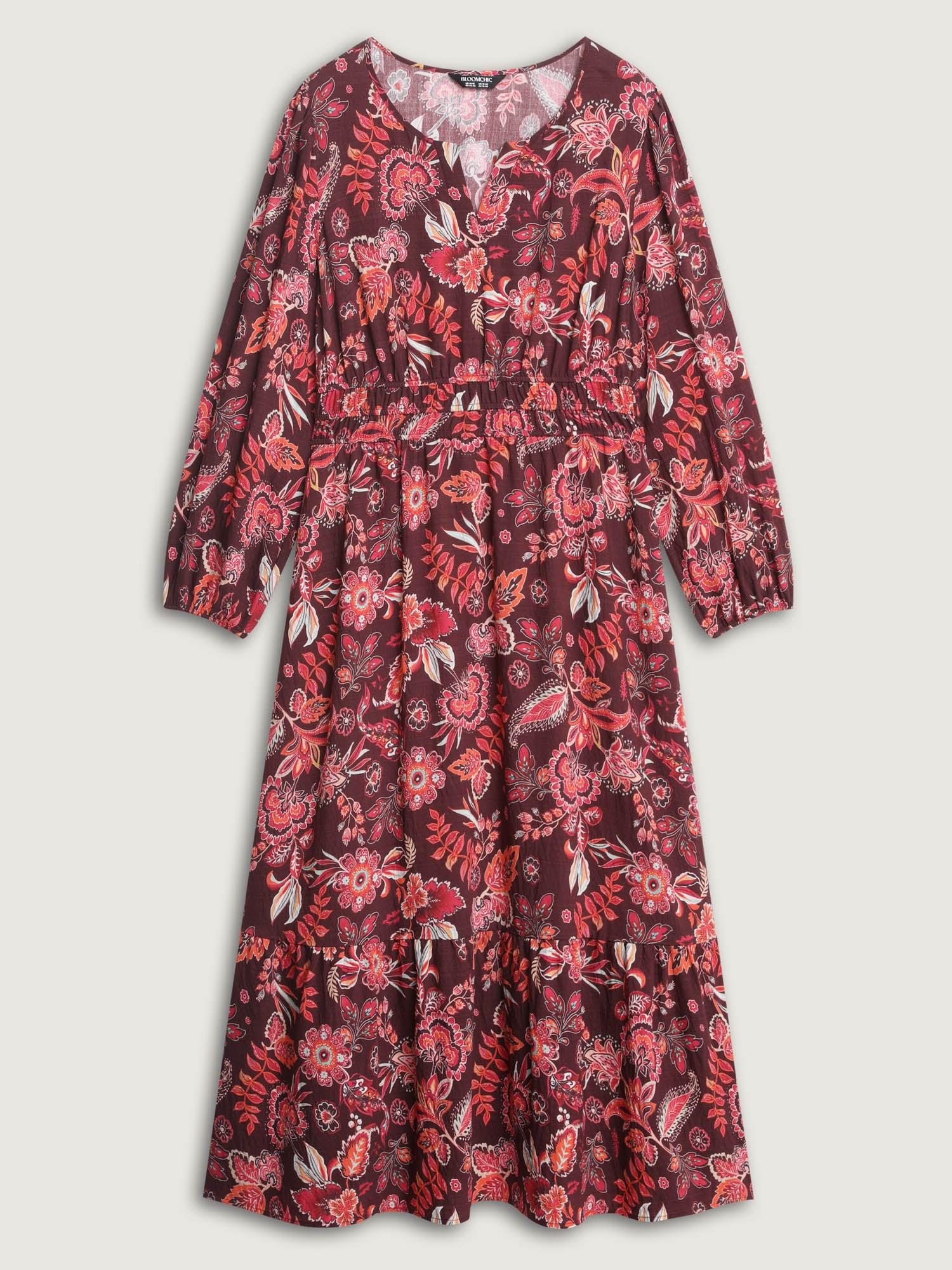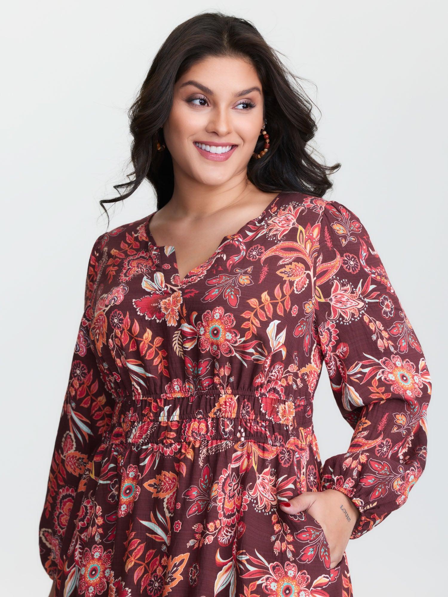 Shop Boho Floral Print Cinched-Waist Maxi Dress now and redefine your style with confidence at BloomChic. Tailored for mid and plus-size women. This trendy Dress, sizes 10-30. You can never go wrong with BloomChic Dresses. Color:Burgundy;Style:Boho;Neckline:Notched collar;Sleeve Type:Lantern Sleeve;Prints:Bohemian print;Pocket:Side seam pocket;Belt:No-belt;Closure Type:Non