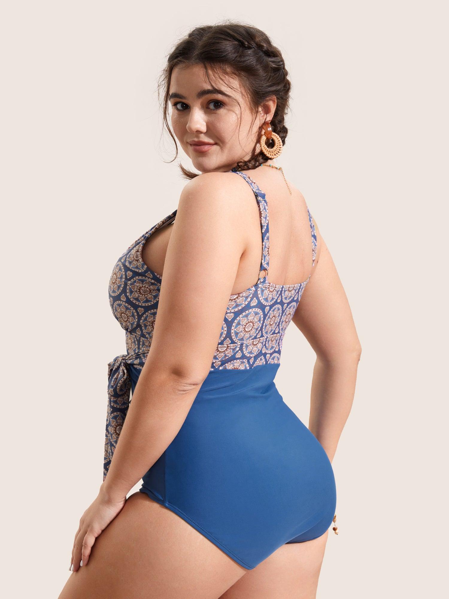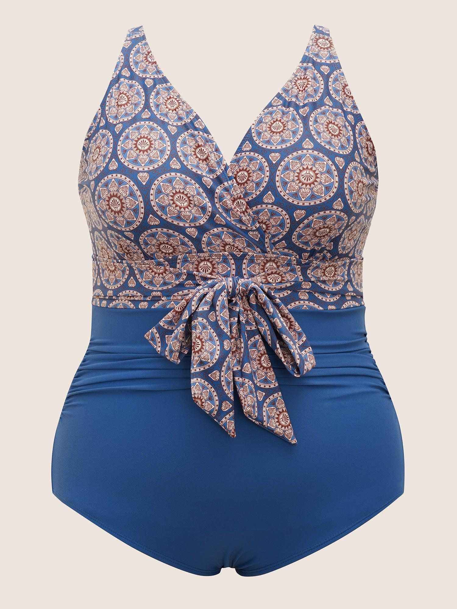Shop Boho Print Overlap Collar Patchwork One Piece Swimsuit now and redefine your style with confidence at BloomChic. Tailored for mid and plus-size women. This trendy Swimwear Women, sizes 10-30. Season:Summer;Color:Indigo;Style:Beach;Cup Type:Removable cups;Neckline:Overlap Collar;Sleeve Type:Sleeveless;Prints:Bohemian print;Details:Belted, Gathered, Patchwork;Pocket:No-pocket;Belt:No-belt;Chest pad:Removable Padding;Lining:Lining;Closure Type:Non