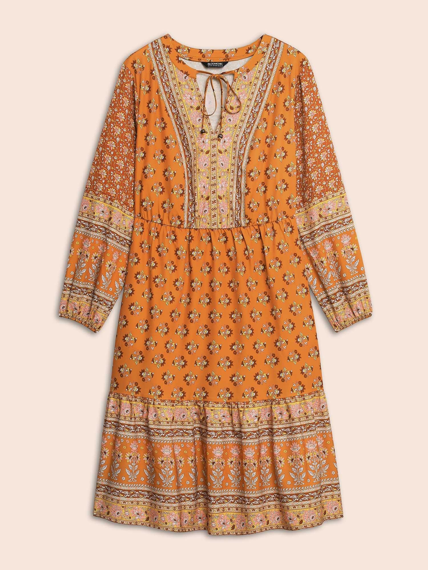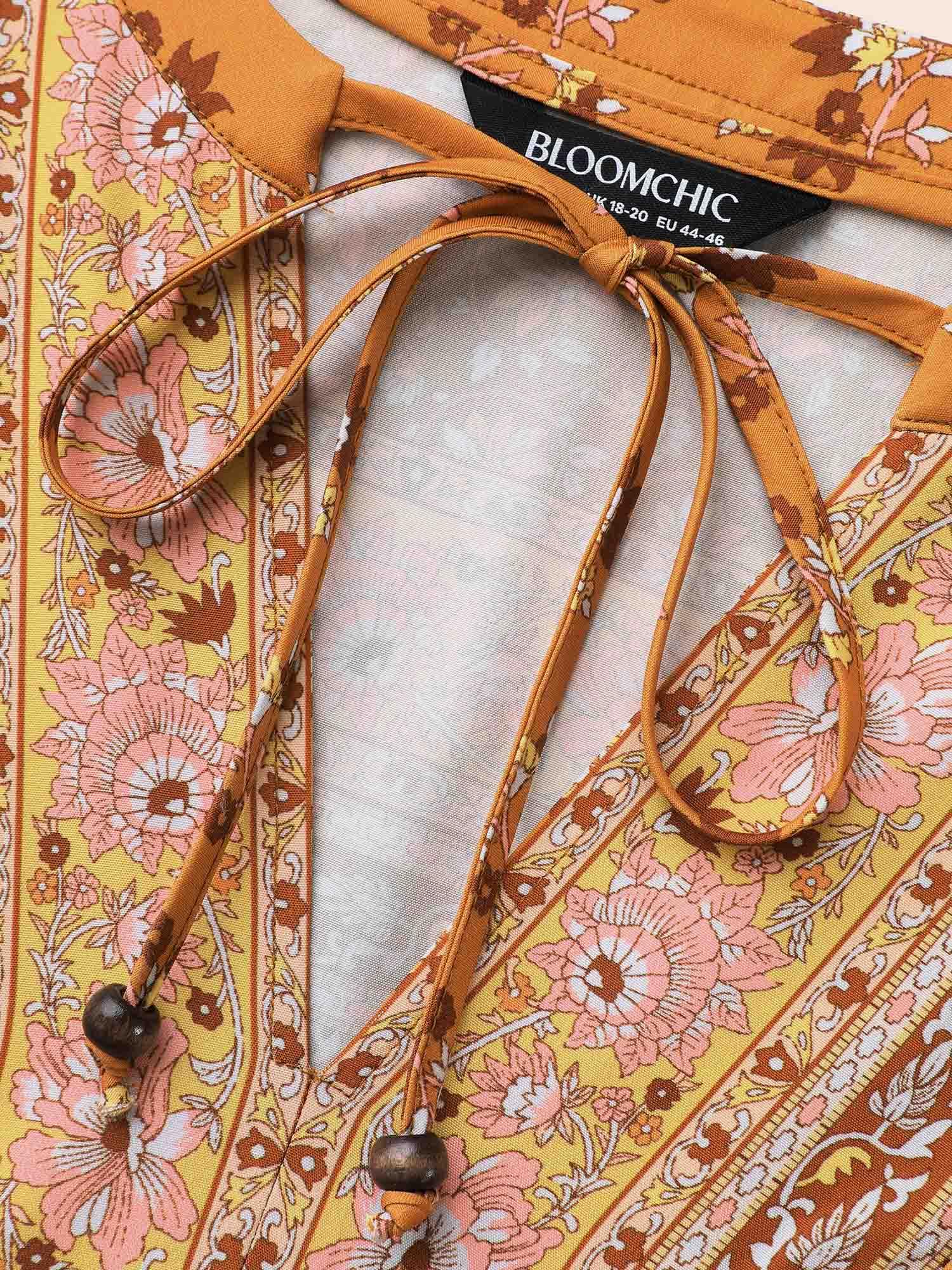 Shop Boho Print Tie Knot Midi Dress now and redefine your style with confidence at BloomChic. Tailored for mid and plus-size women. This trendy Dress, sizes 10-30. You can never go wrong with BloomChic Dresses. Season:Winter;Color:Turmeric;Style:Resort;Neckline:V-neck;Sleeve Type:Lantern Sleeve;Prints:Bohemian print;Details:Tie knot;Pocket:Side seam pocket;Belt:No-belt;Closure Type:Non