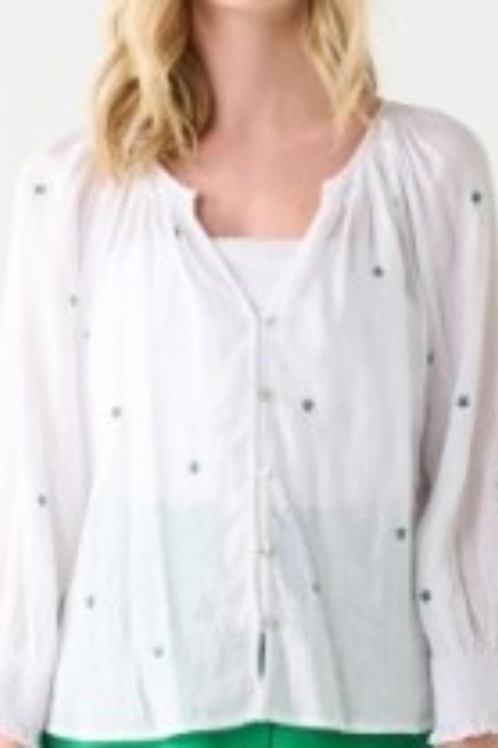 Boho blouse with mini embroidered flowers and a fitted stretch wrist.