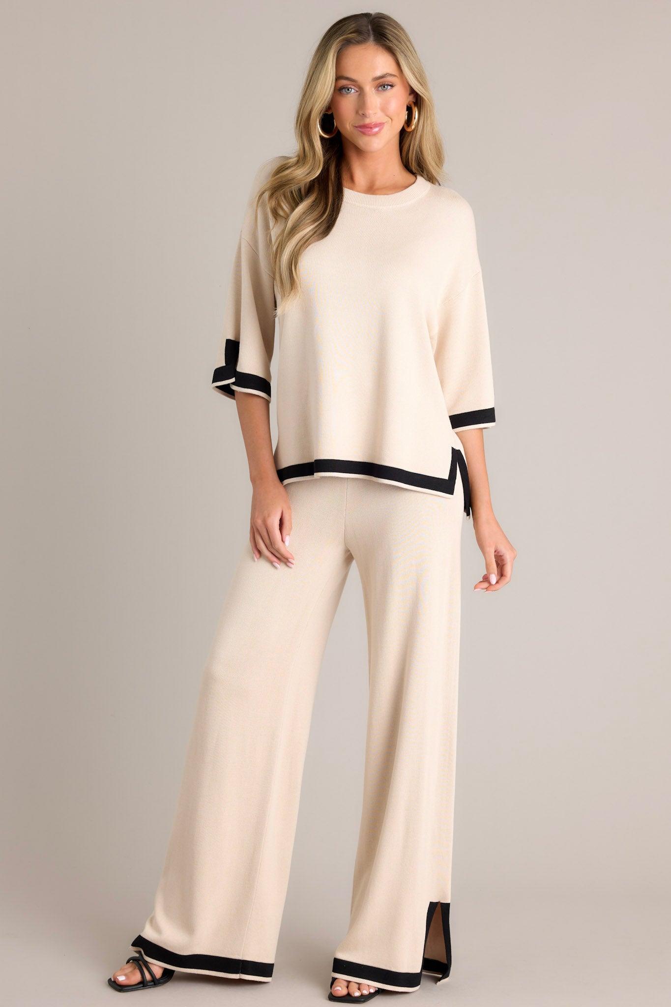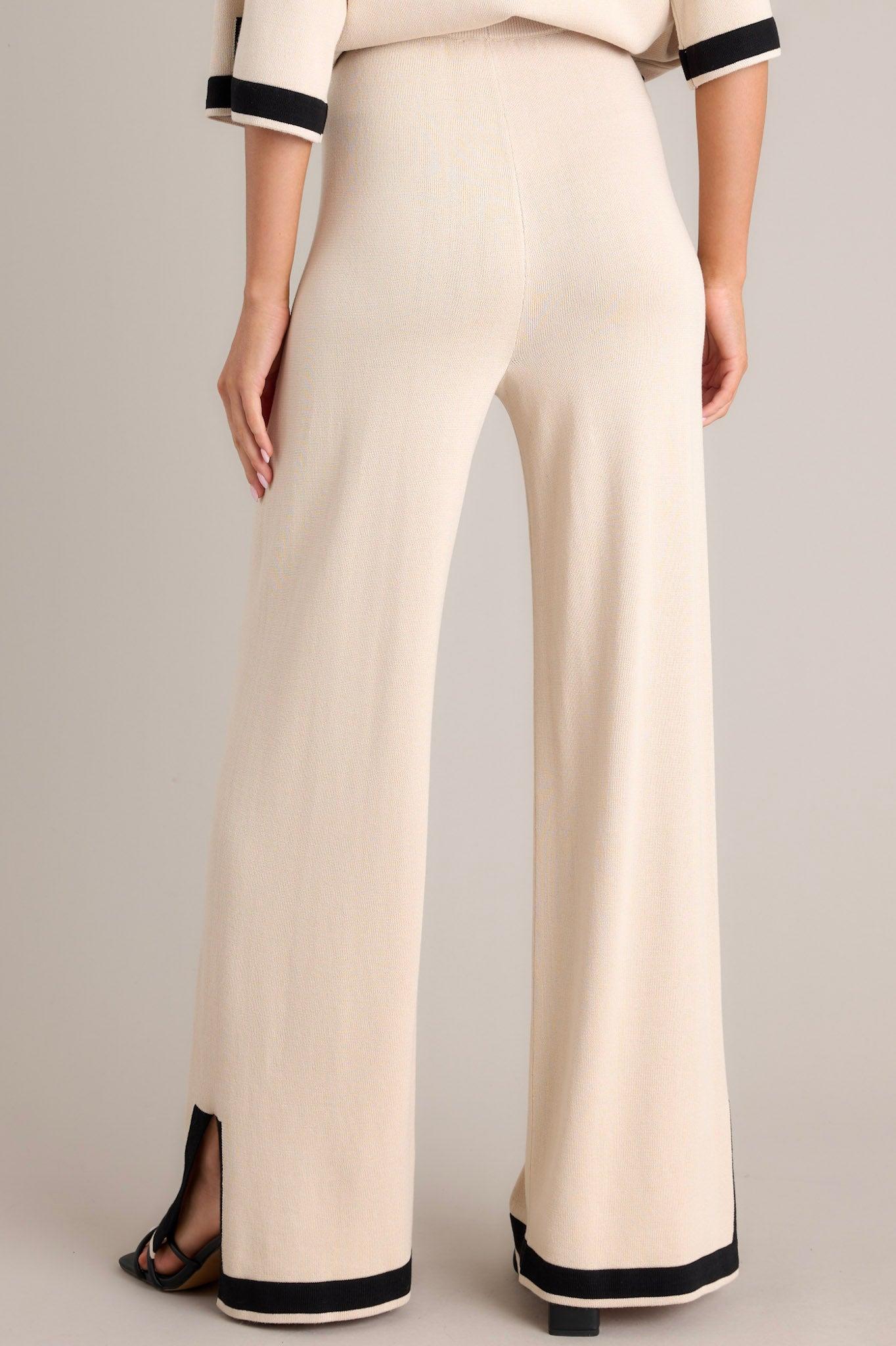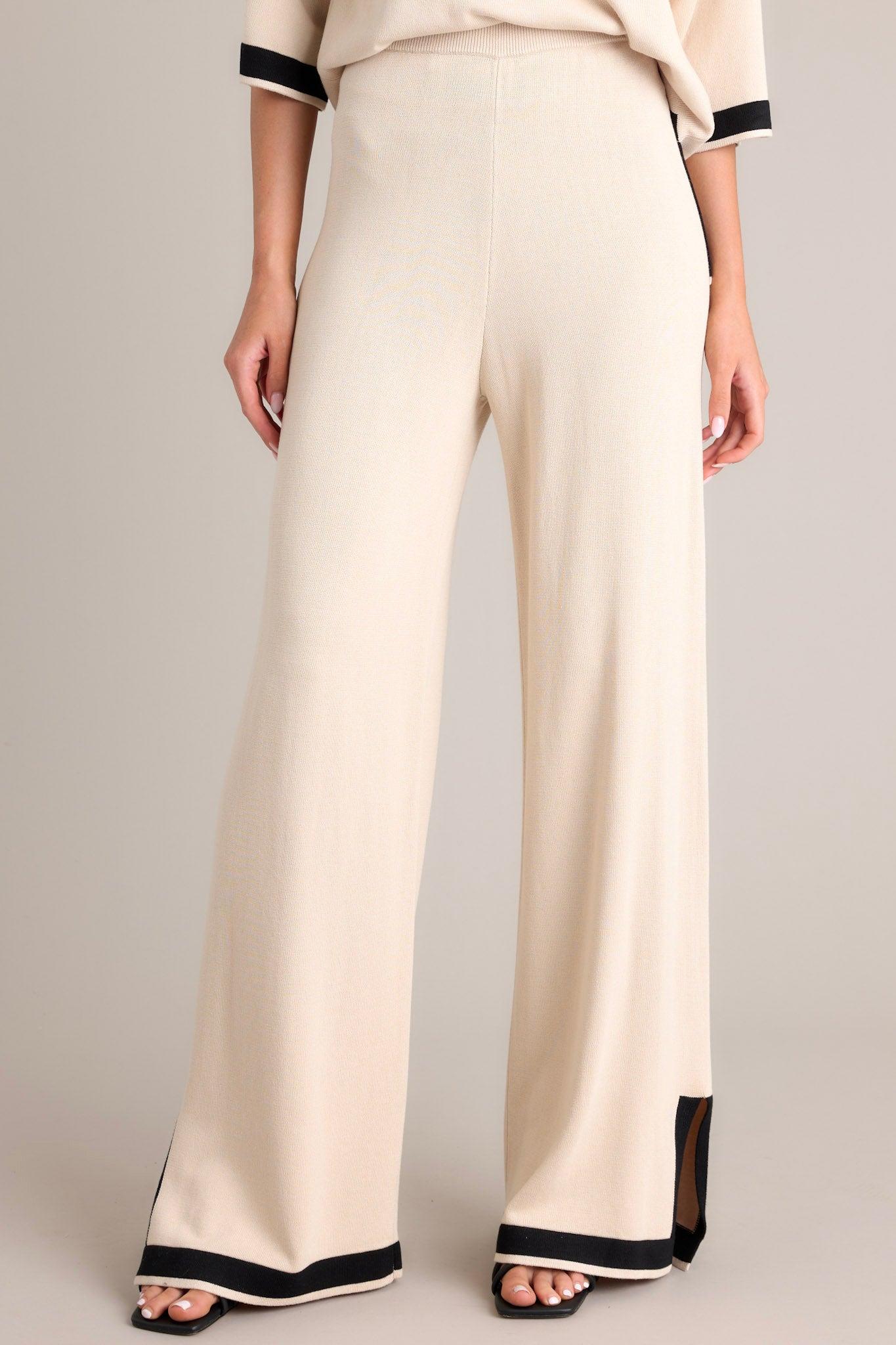 Introducing the Bold Symphony Beige Pants! These stylish and versatile pants are sure to make a statement. Made with high-quality materials, they provide both comfort and durability. Elevate your wardrobe with these pants that perfectly balance fashion and function. These beige sweater pants feature a high waisted design, an elastic waistband, a wide leg, and a contrasting split hemline. 100% Viscose Unlined Hand Wash Cold Manufactured in China Designed in the USA Model is wearing a size small