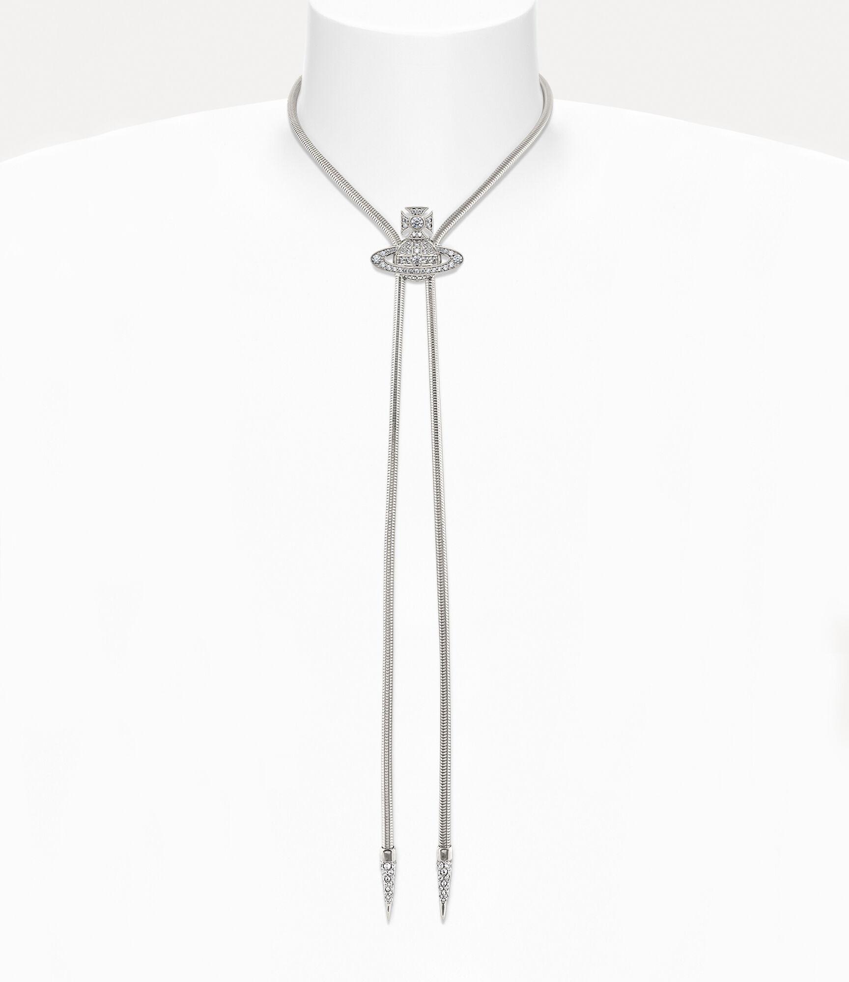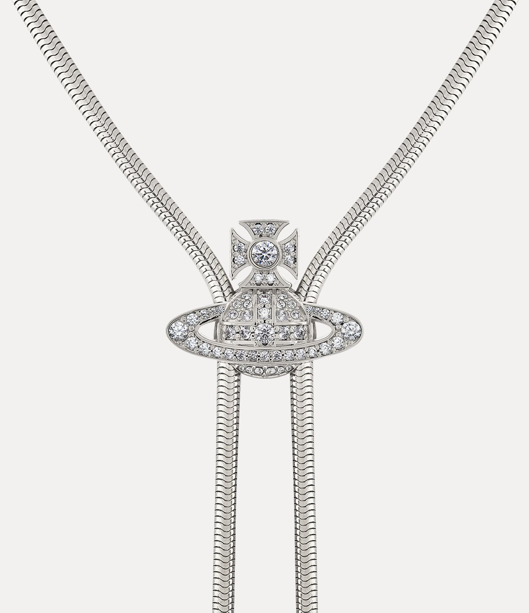 Our Bolo tie with platinum-tone plating features pavé crystal-embellished detailing, taking inspiration from our house's signature orb-shaped motif. The platinum-plated tie is constructed with a snake chain, embellished with crystal tips to complete the design.