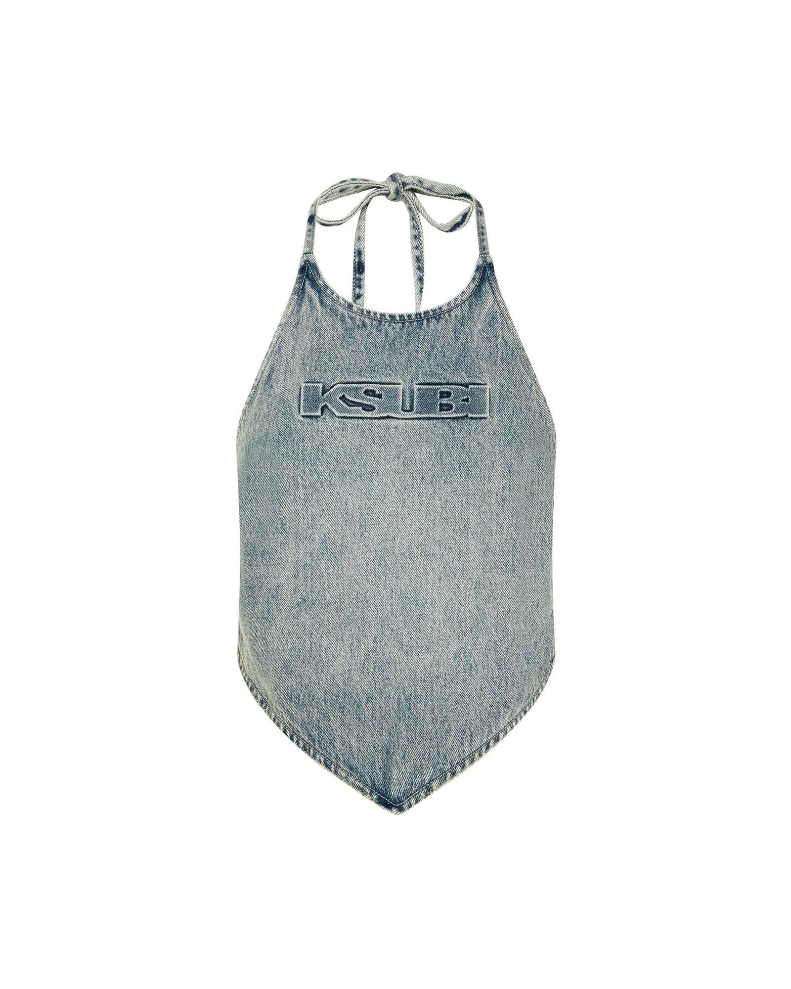 The Bolt Top Folk is a backless scarf top made from premium rigid indigo denim with a neutral tint and subtle signs of wear. It features self-ties at the neck and back waist for an adjustable fit, is fully lined and finished with Ksubi embossed branding on the front.