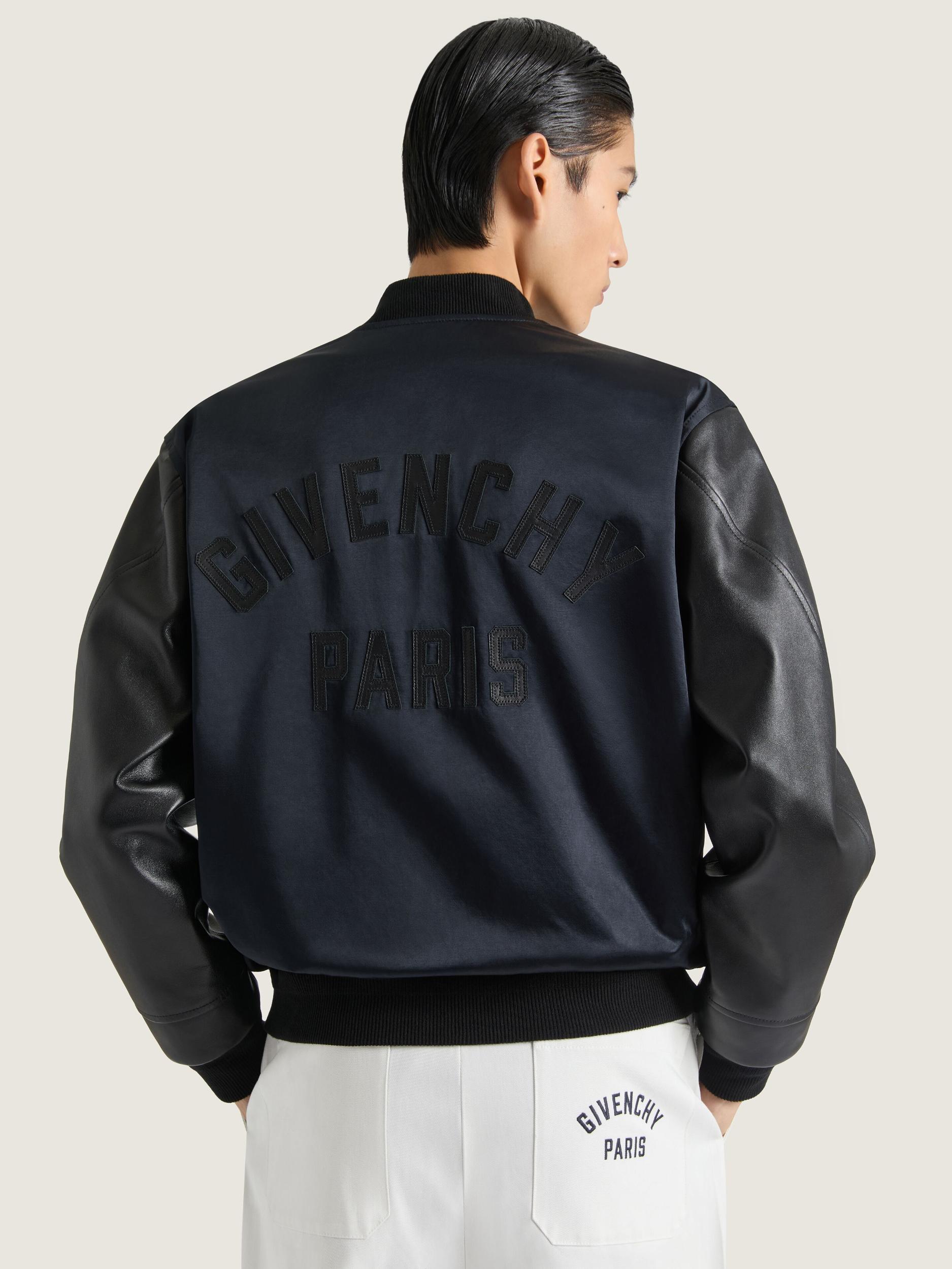 Bomber in satin with nappa leather sleeves. Bomber collar. GIVENCHY Paris leather patch on the back. Zipped closure. Two side zipped pockets. Elasticated knitted collar, hem and cuffs. Bias seams for a cocooning volume. Relaxed fit. Model measures 6.1 Feet and wears a size 48.