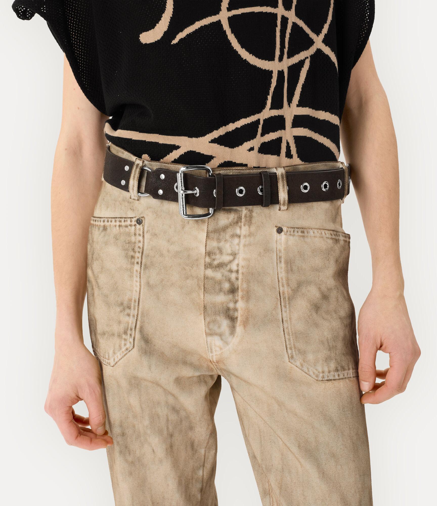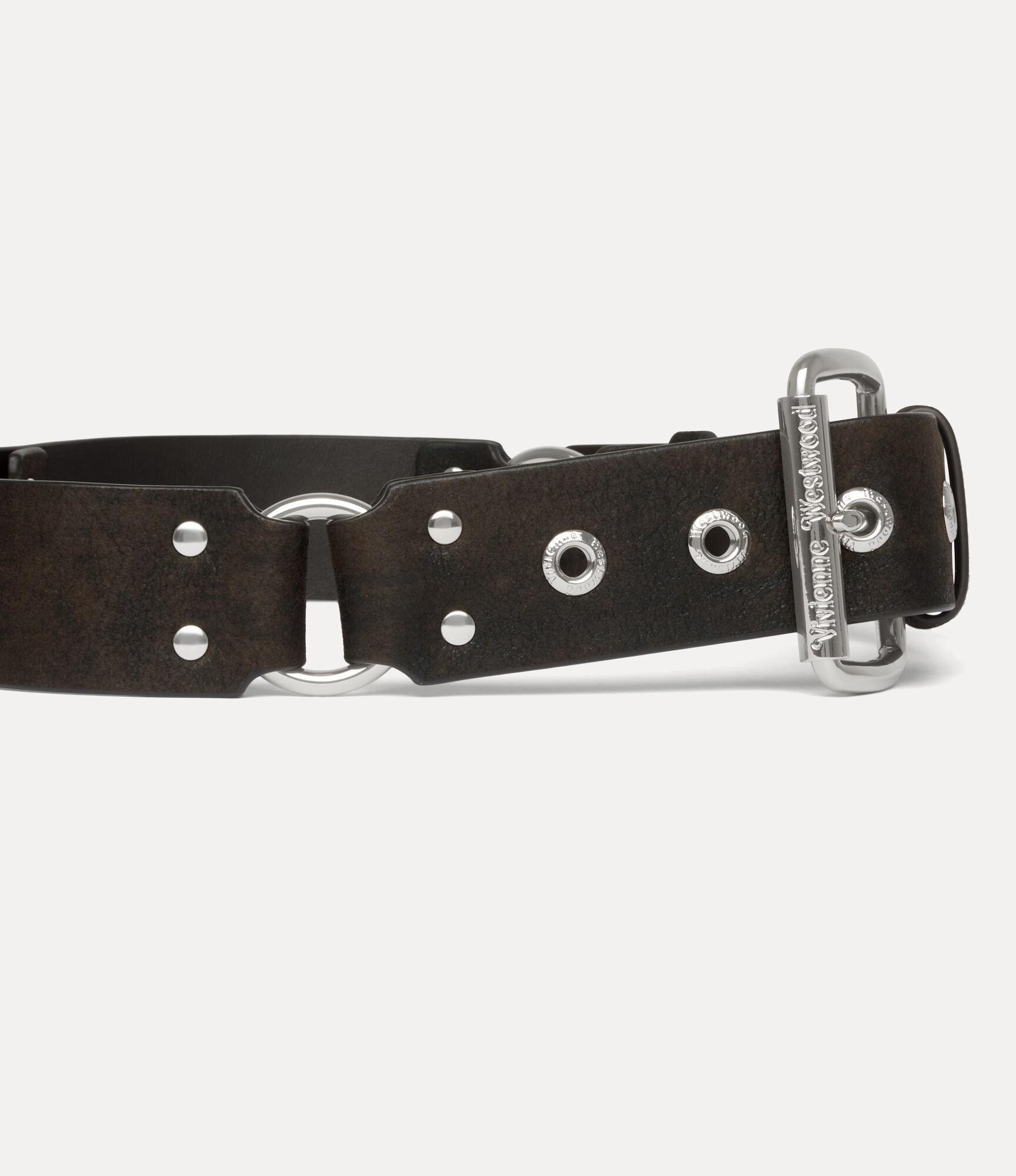 Our Bondage belt is reimagined in this season’s distressed leather, accented with the house’s signature silver-tone hardware. The design features bold, bondage-inspired hoops, drawing inspiration from the Vivienne Westwood Spring-Summer 1995 collection, ‘Erotic Zones’.
