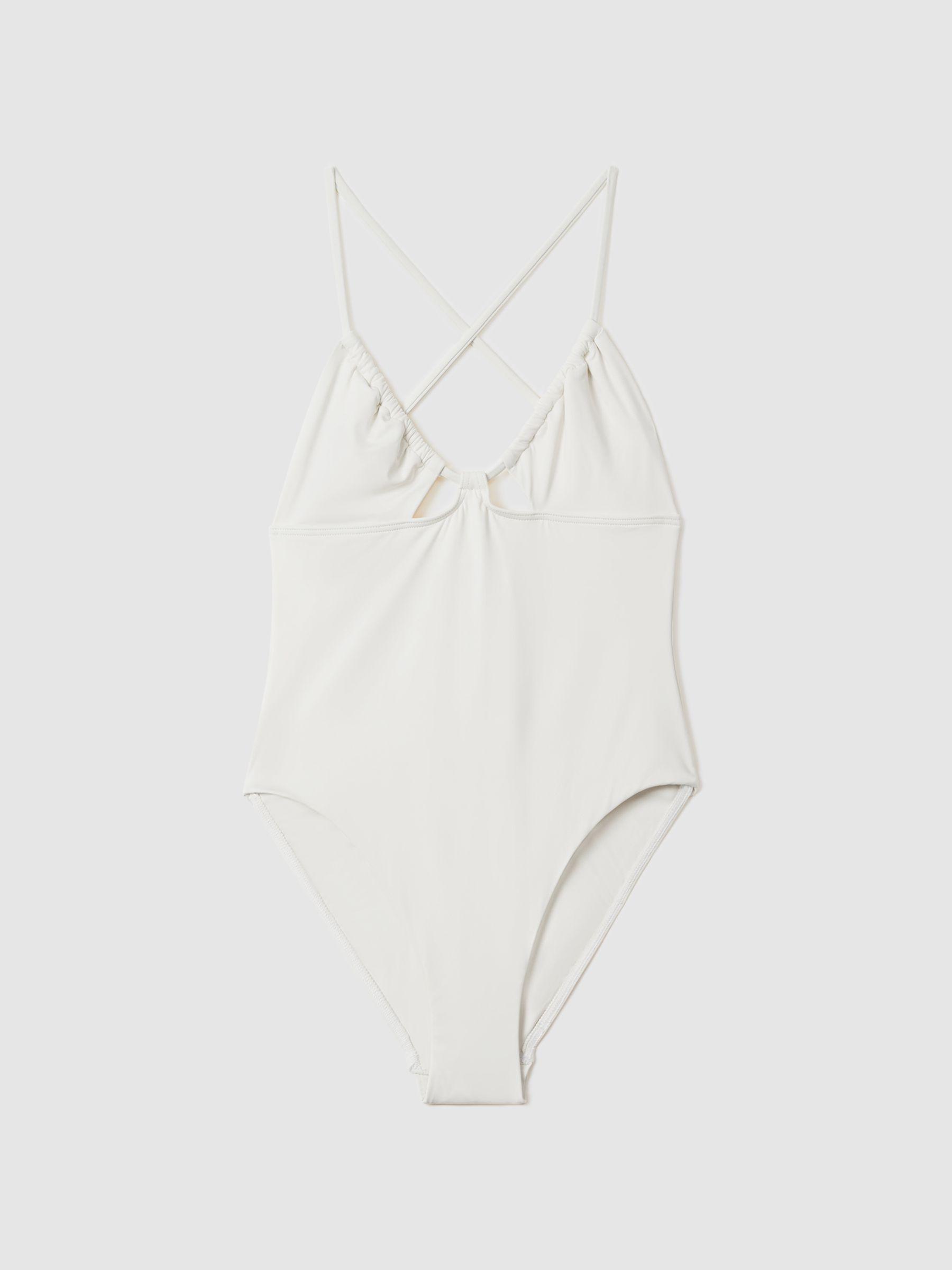 This swimsuit is a modern design, fitted with ruched ups and cross-back straps which tie at the reverse. Cut-outs complement the chest. Cross-back design High-cut leg Cut-out detailing Ruched cups Bondi Born, curated by Reiss, is a range of Australian-style swimwear and ready-to-wear pieces with a focus on technical excellence and performance.