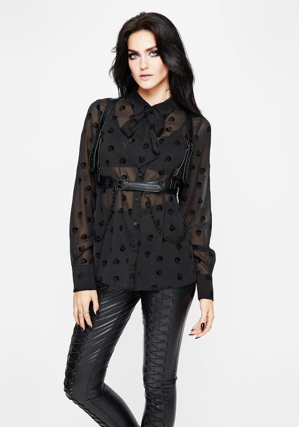 Memento mori- Black skull flocked chiffon pussy-bow collar blouse - Loose fit for easy layering - Snappy pointed collar with a removable self-fabric necktie - Long shirt sleeves end in flat buttoned cuffs - Functional button-up front features shiny gunmetal skull buttons - Textured sheer chiffon fabrication with flocked velour all-over skull motif - Death becomes you 100% polyesterBrianne is 5’7” and wearing a UK8 / US4